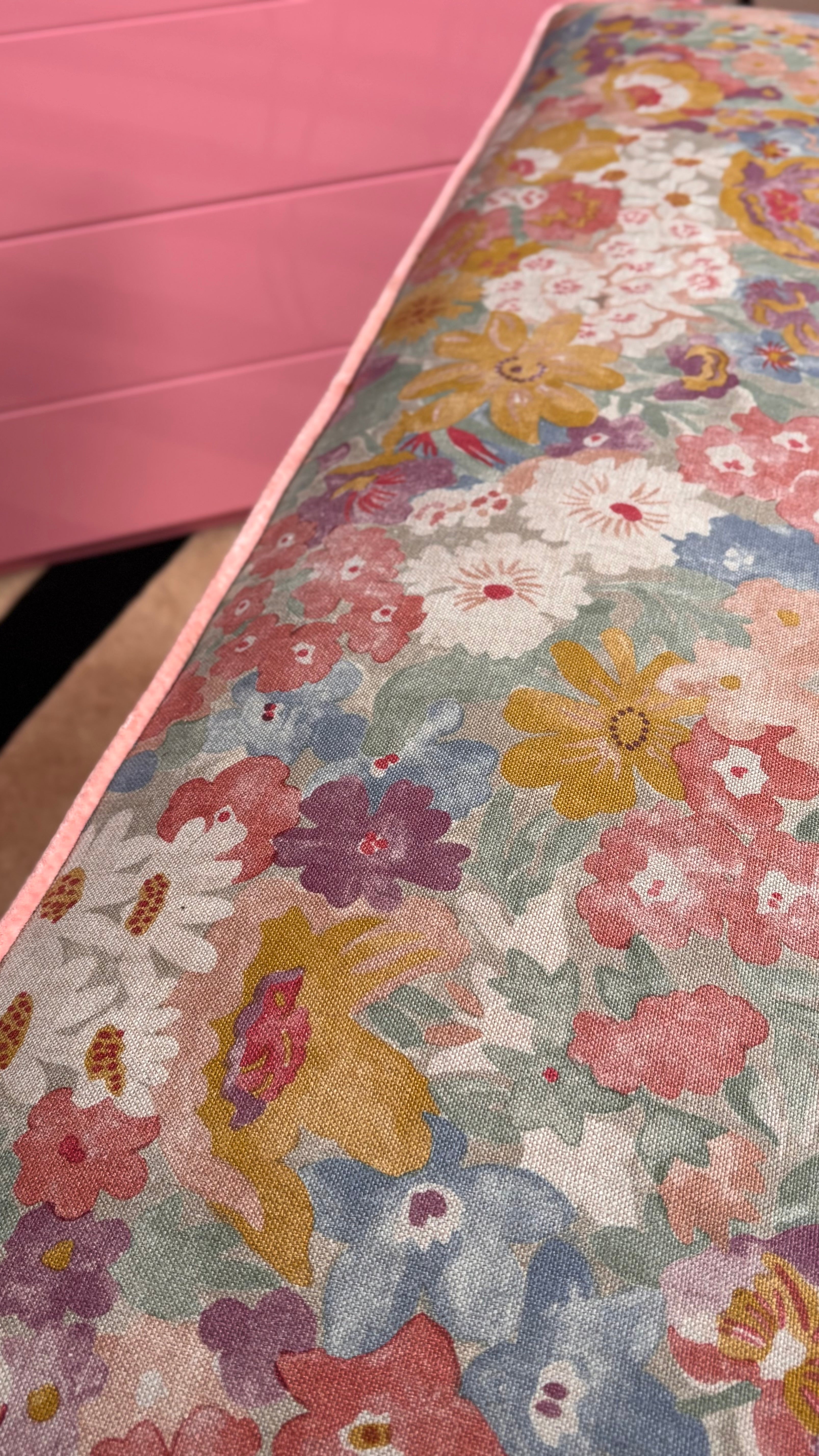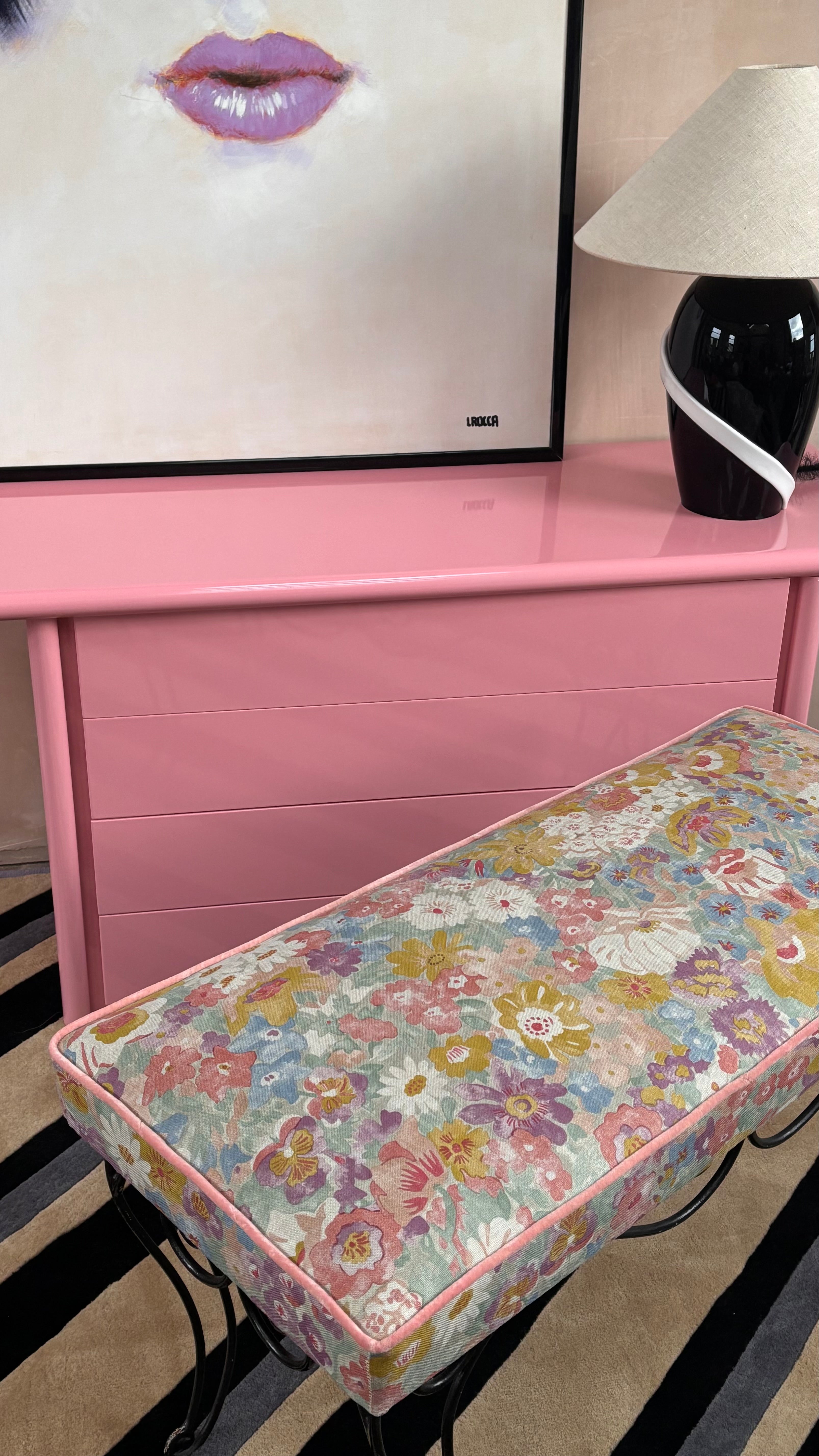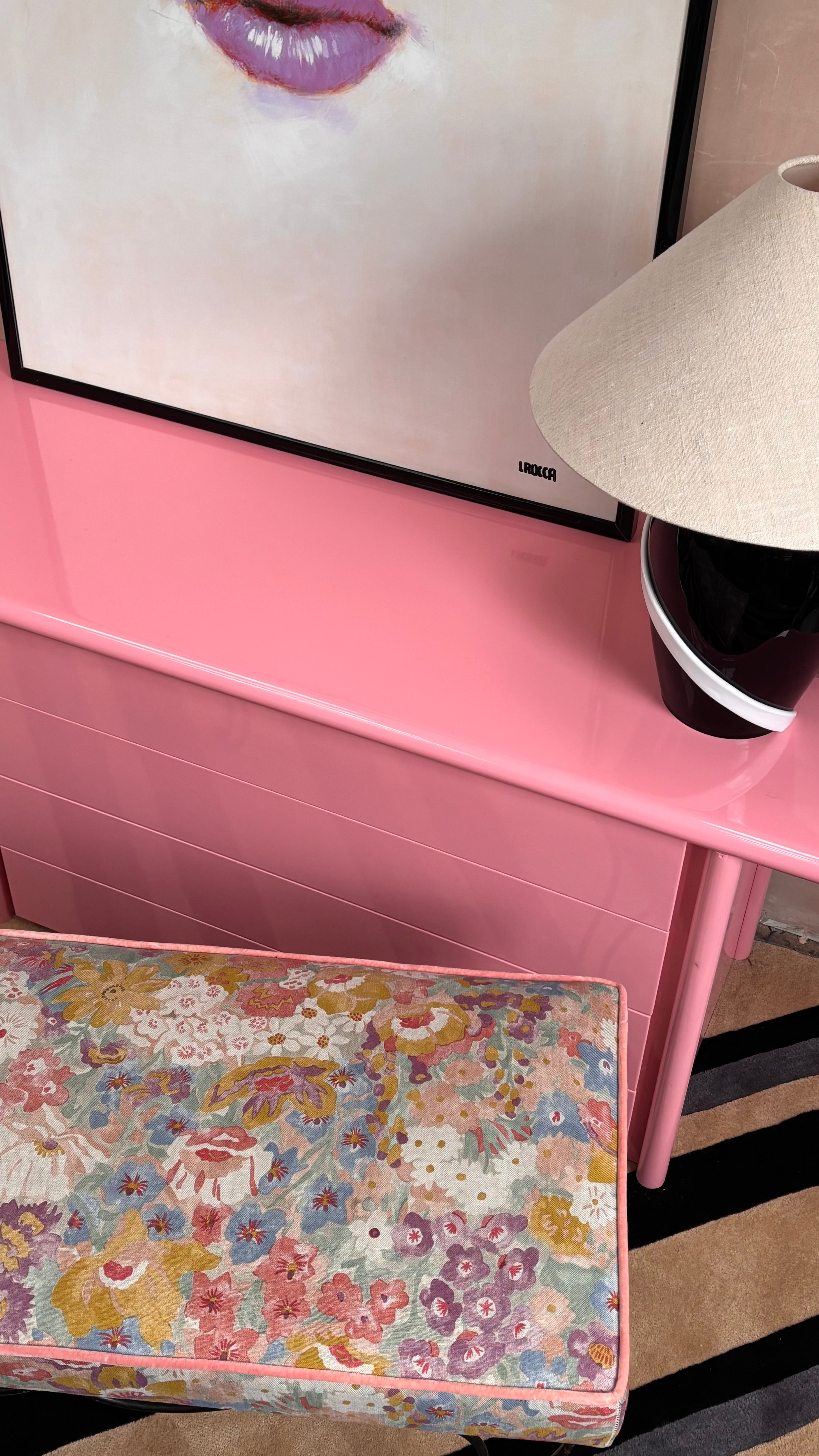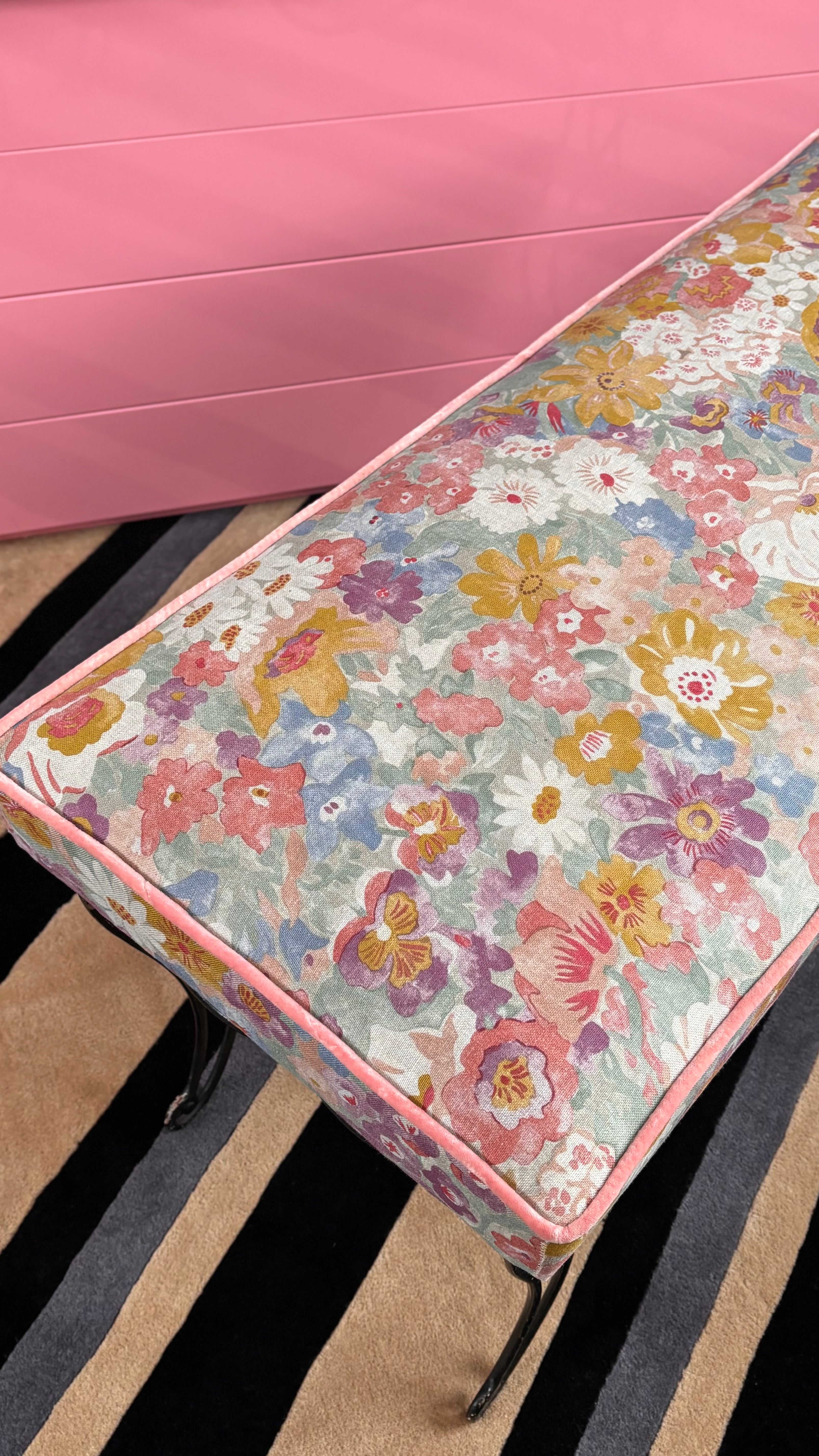 I bought this in Italy. I knew instantly it needed a lovely pastel floral. I chose this heavy linen by Liberty, finished with Pierre Frey sketch pink piping.