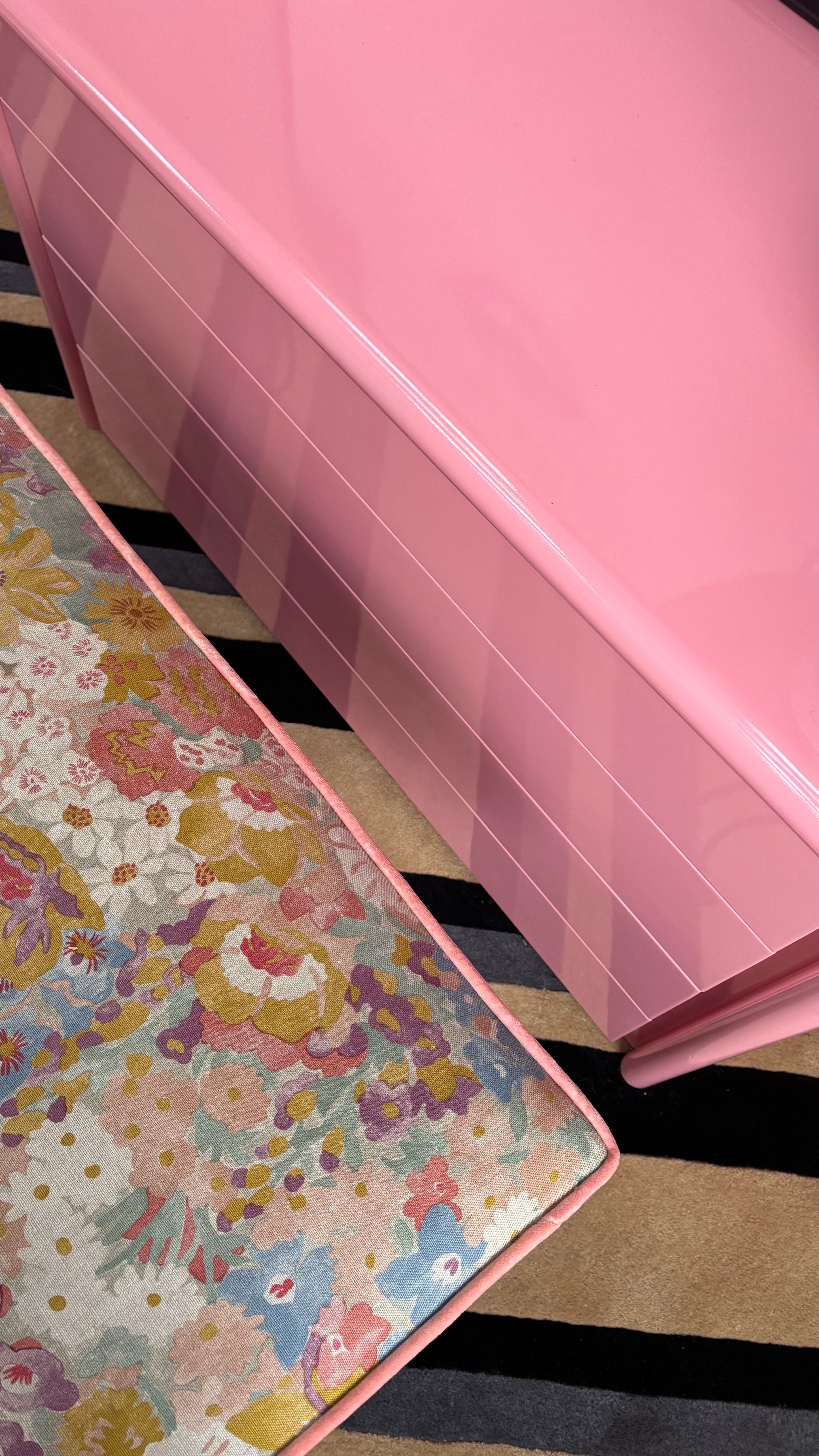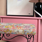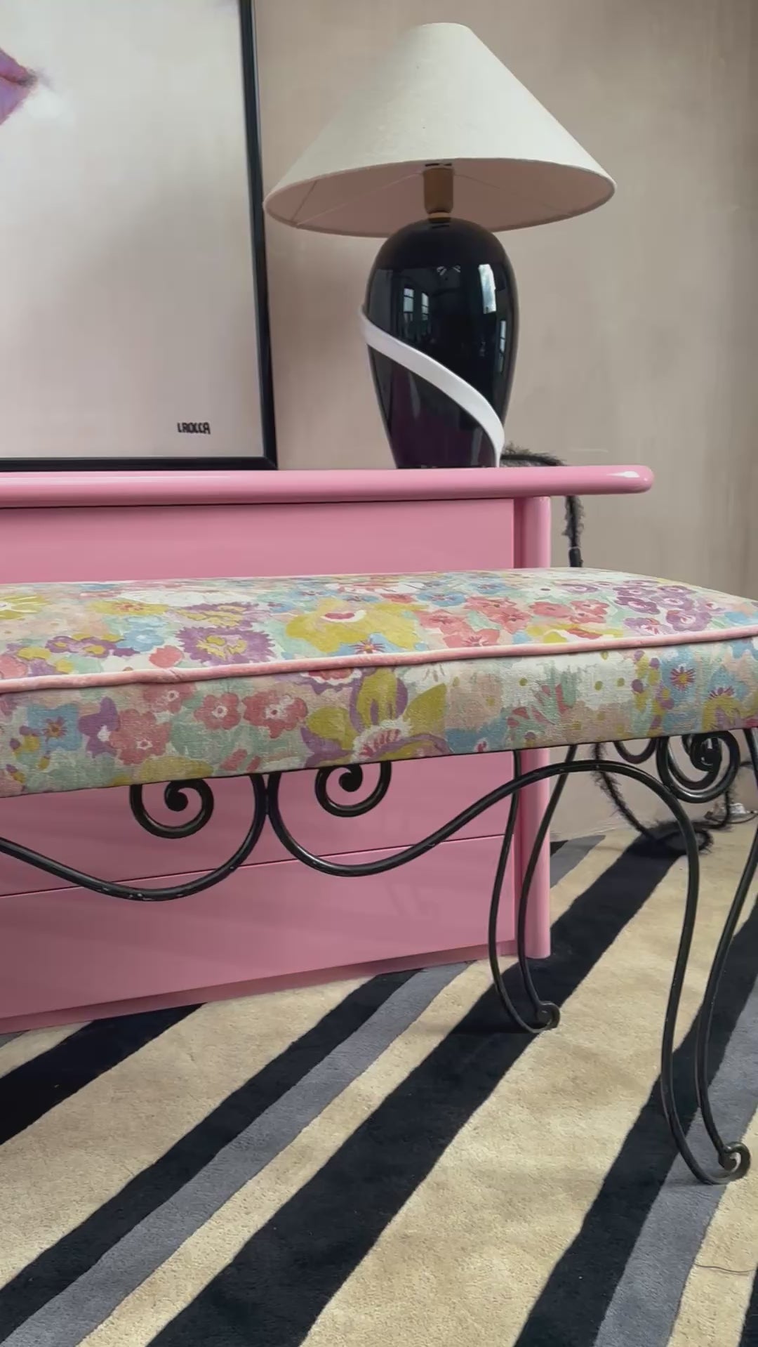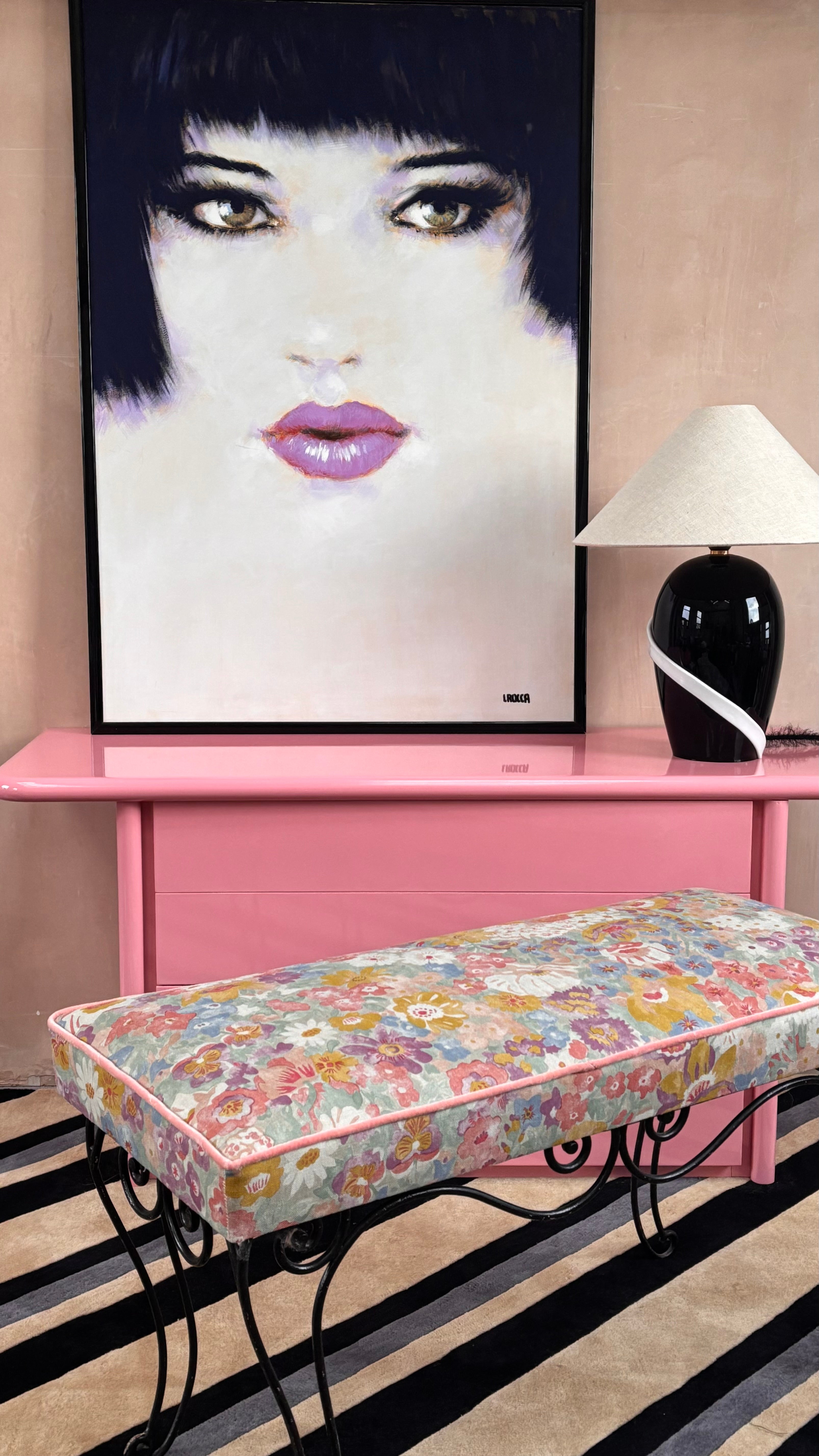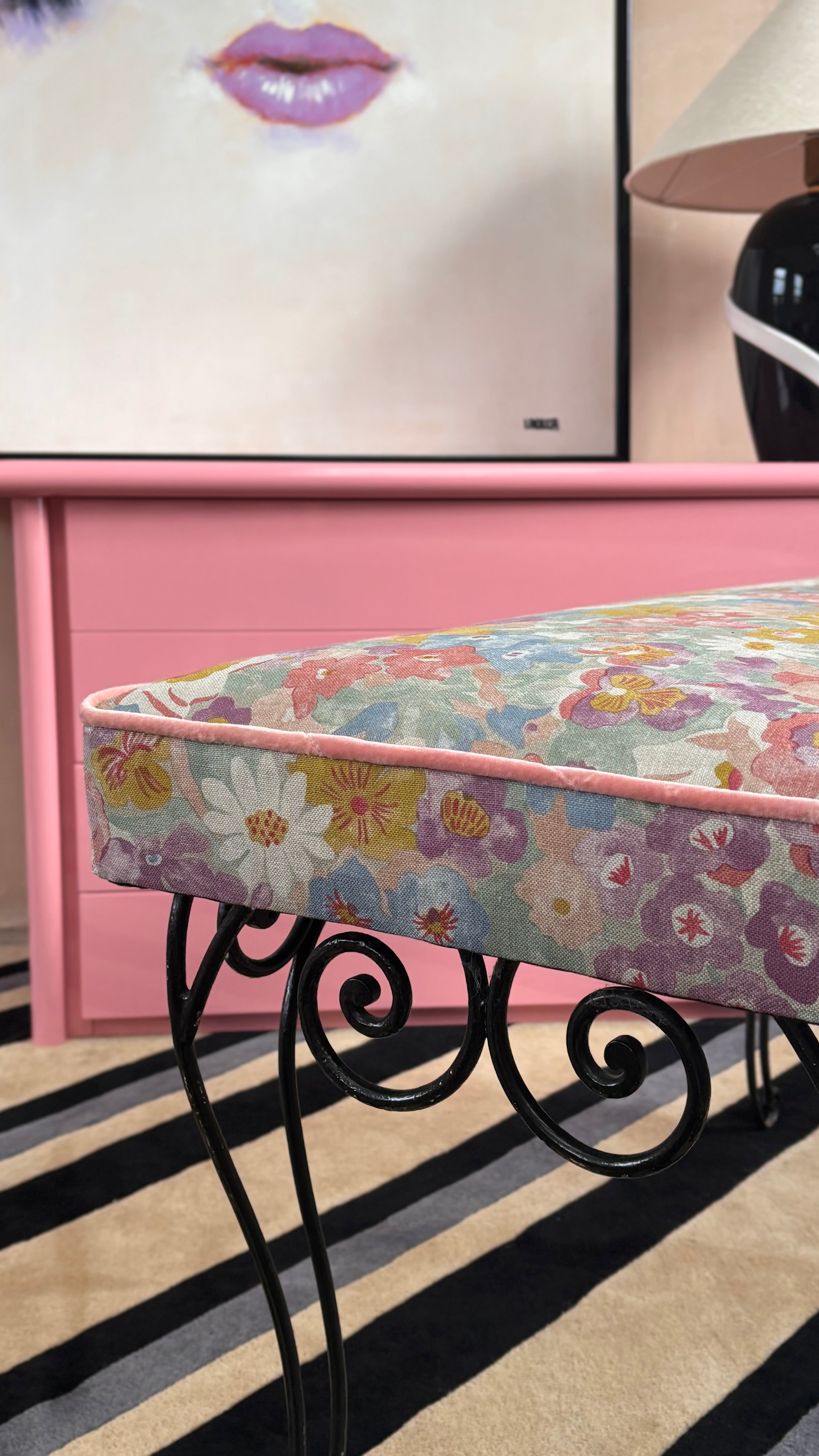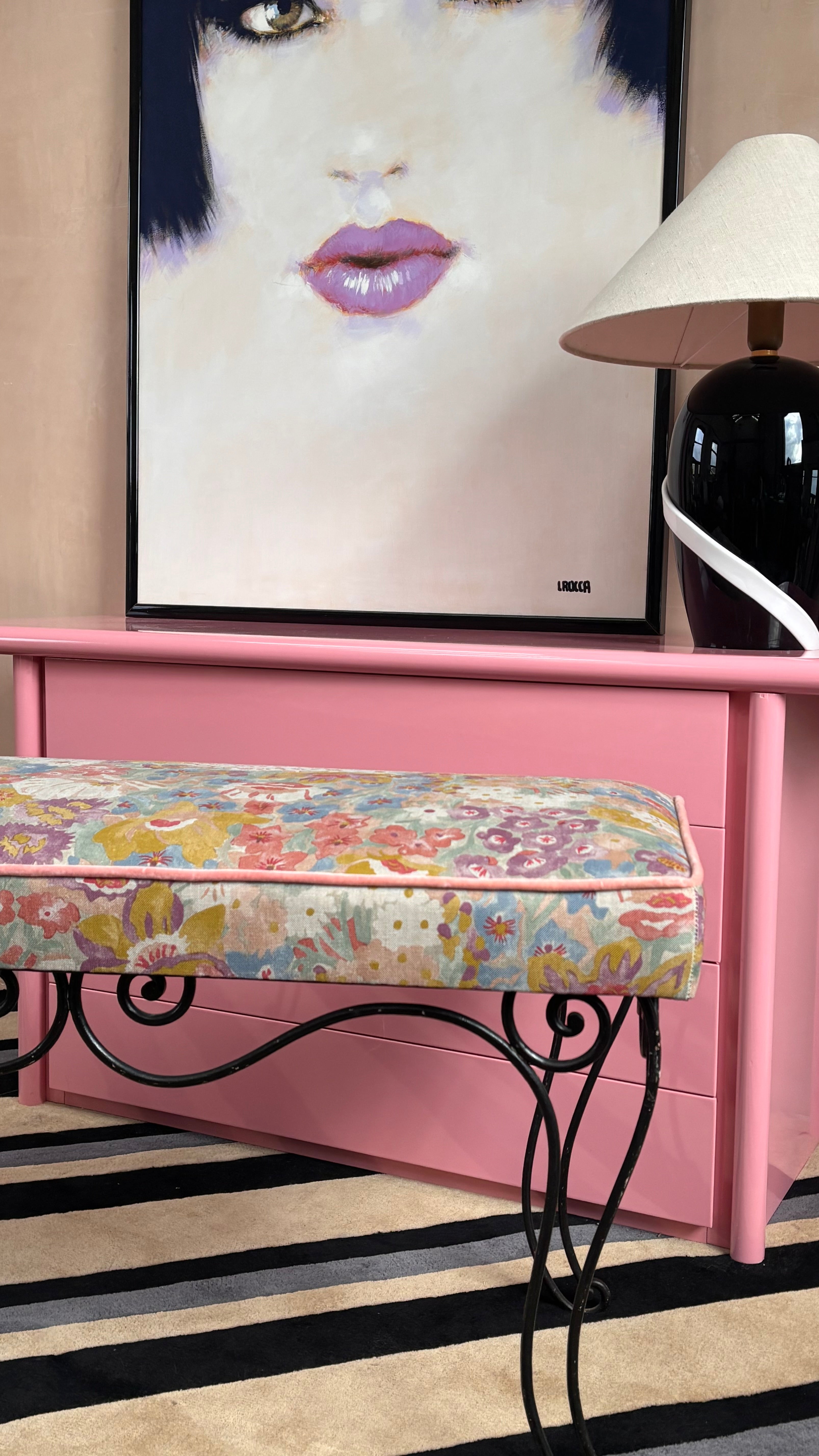 I bought this in Italy. I knew instantly it needed a lovely pastel floral. I chose this heavy linen by Liberty, finished with Pierre Frey sketch pink piping.