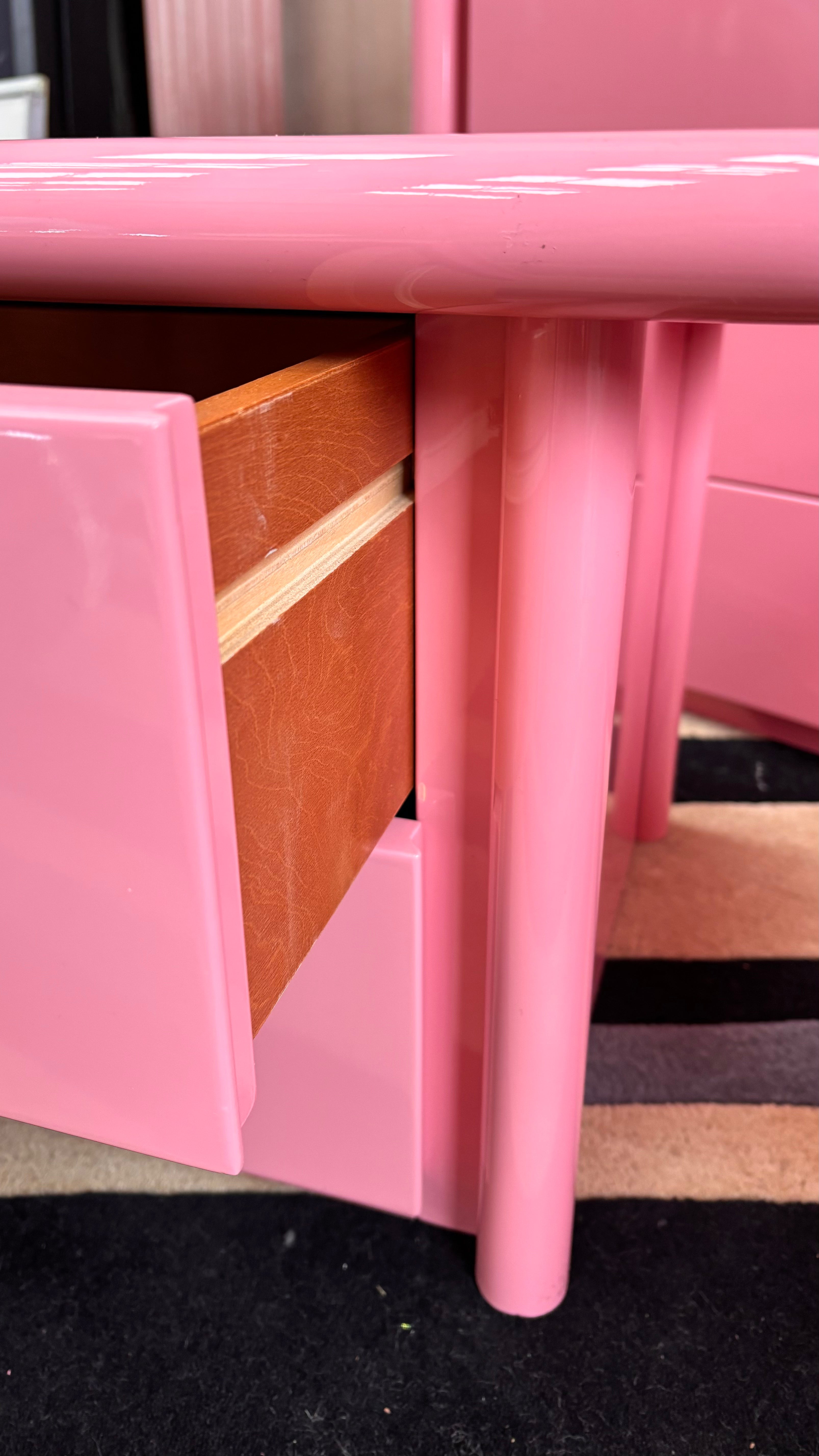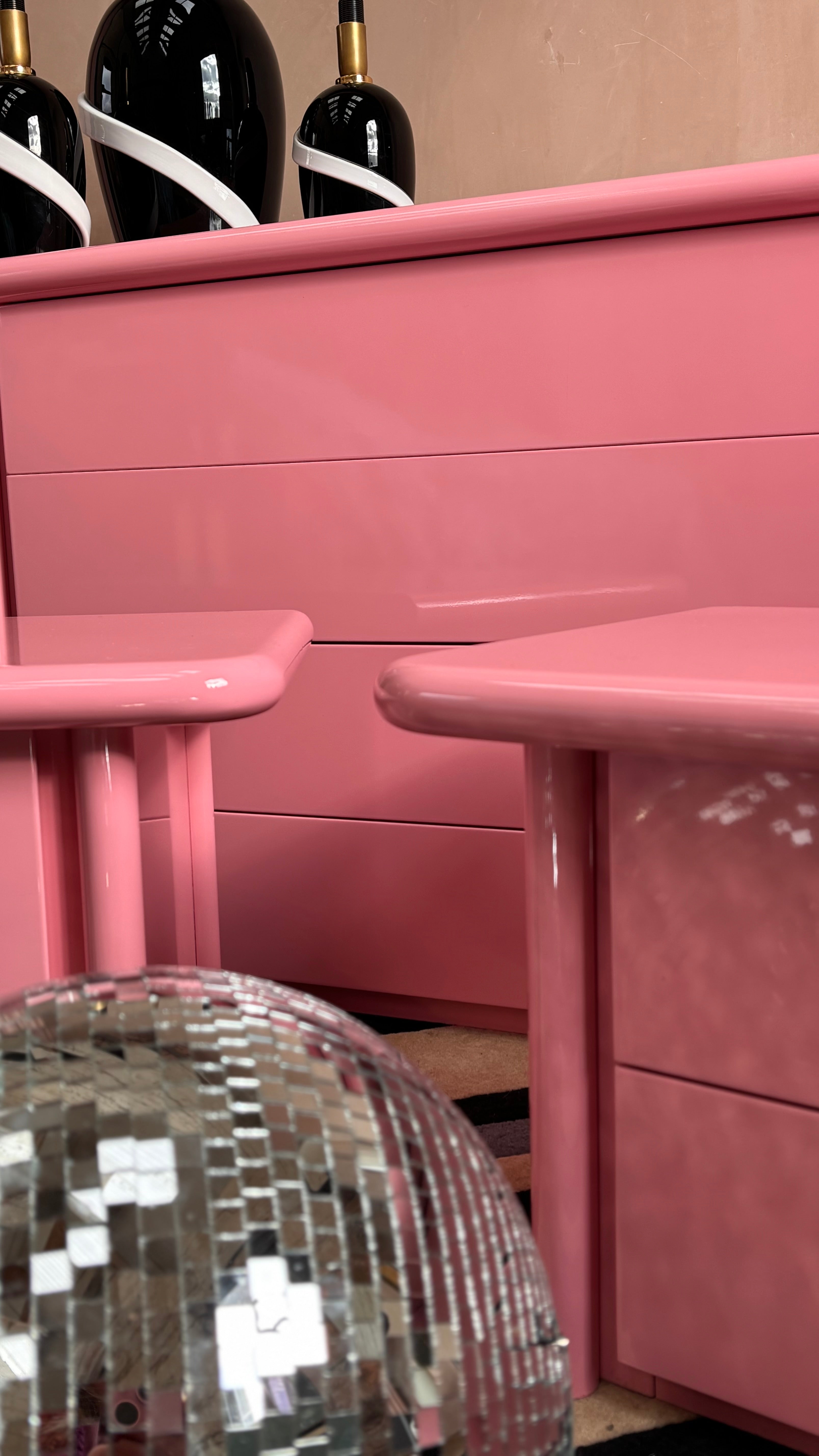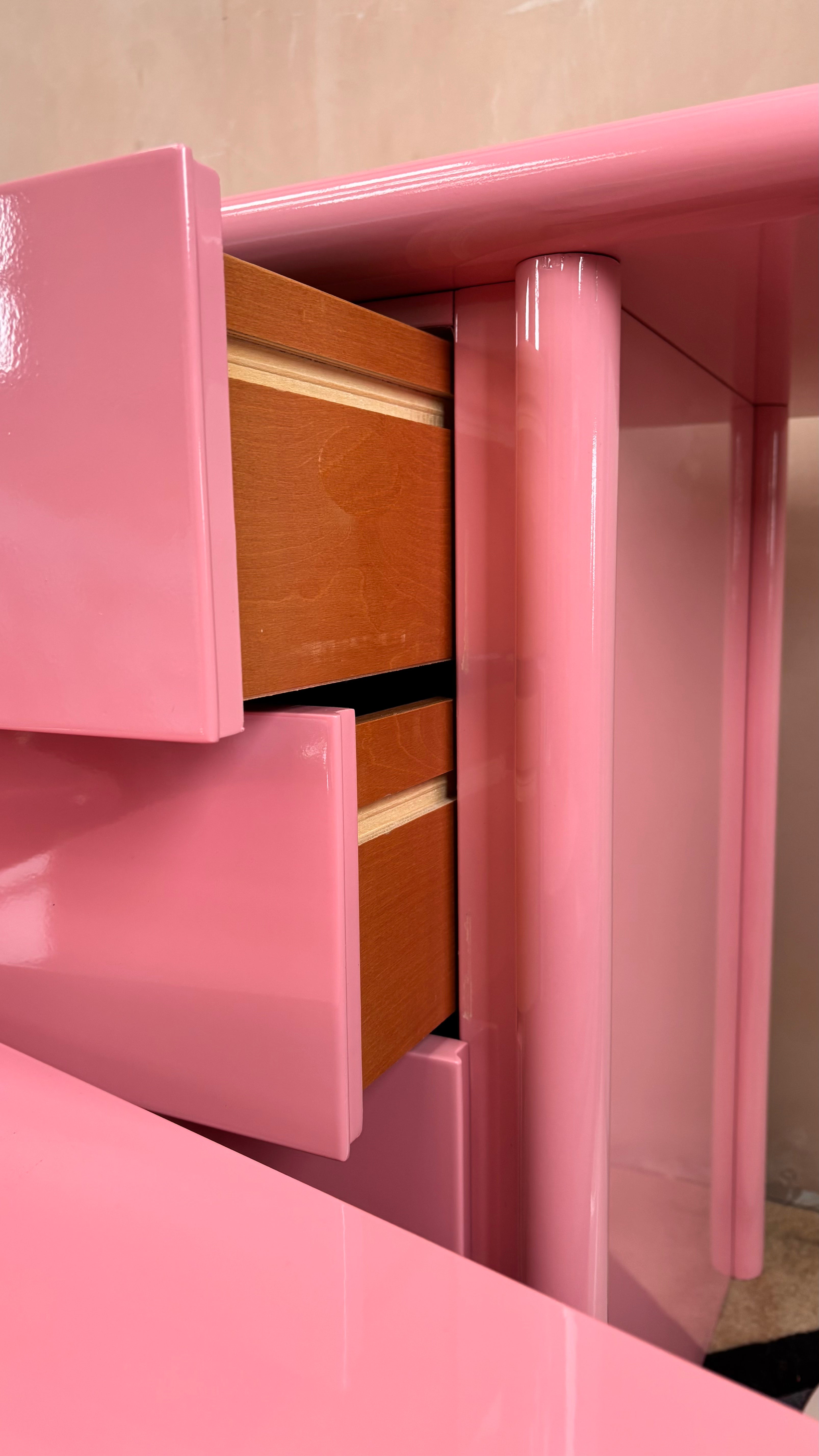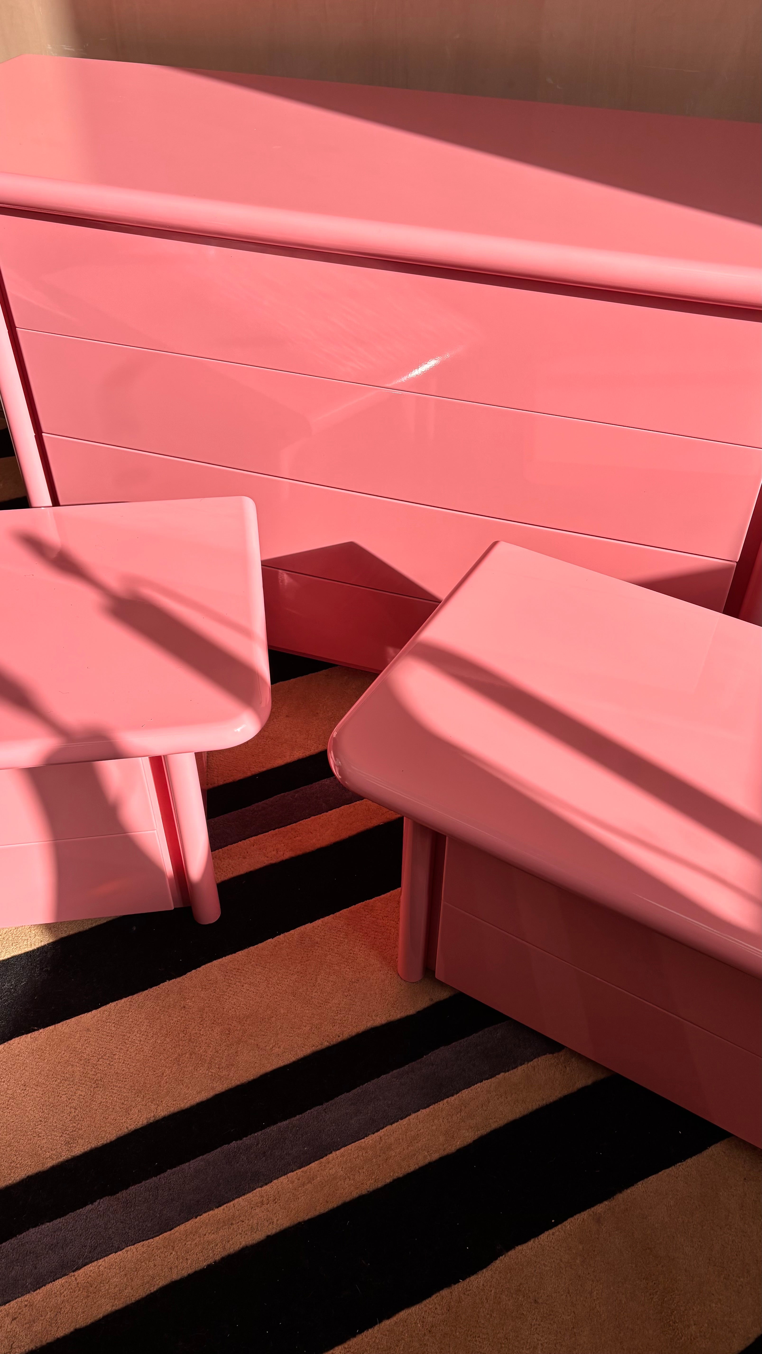 Outstanding 1980s handmade, signed Italian pink bedroom furniture set. Consists of large chest of drawers and two matching side drawers.