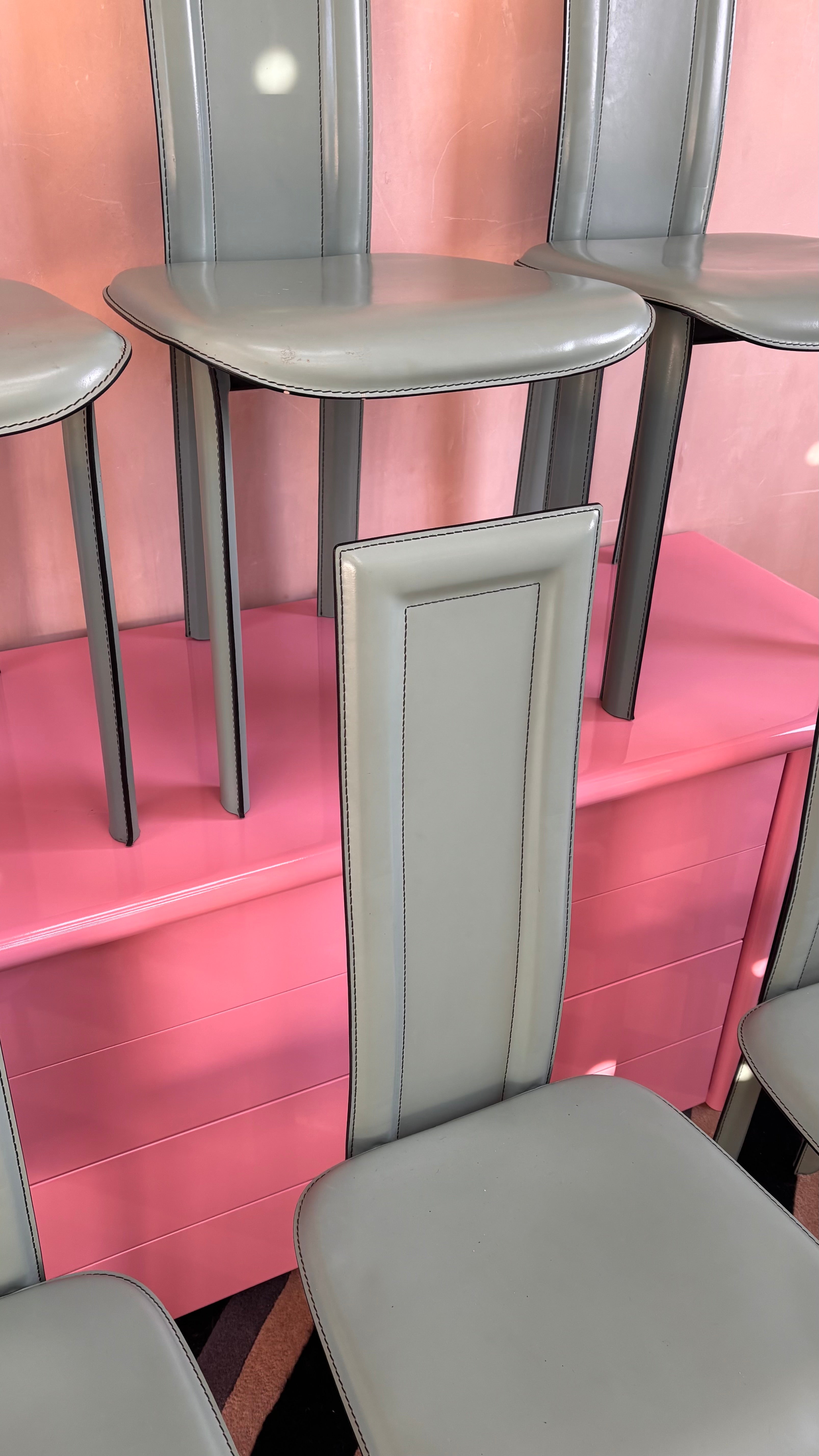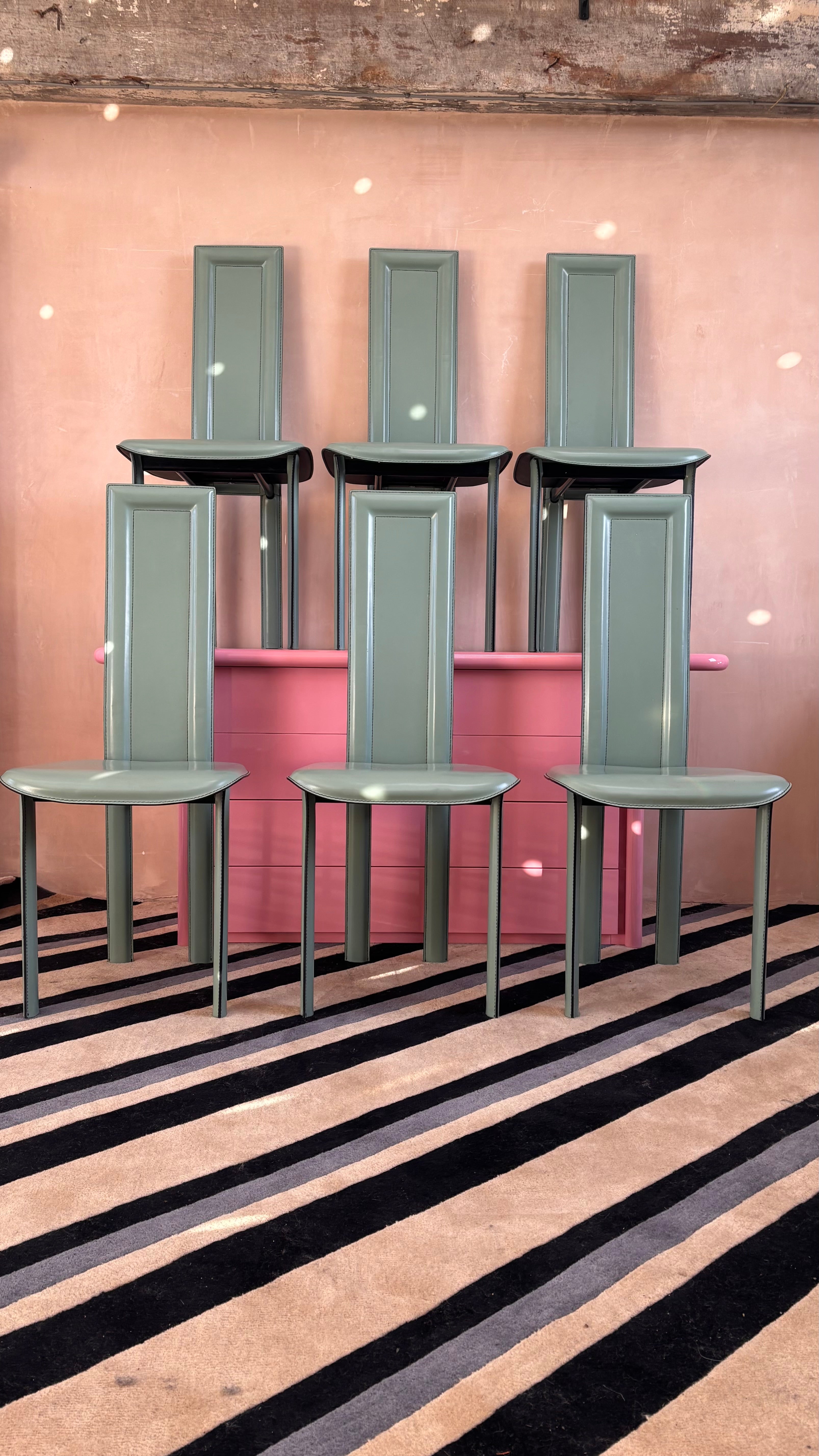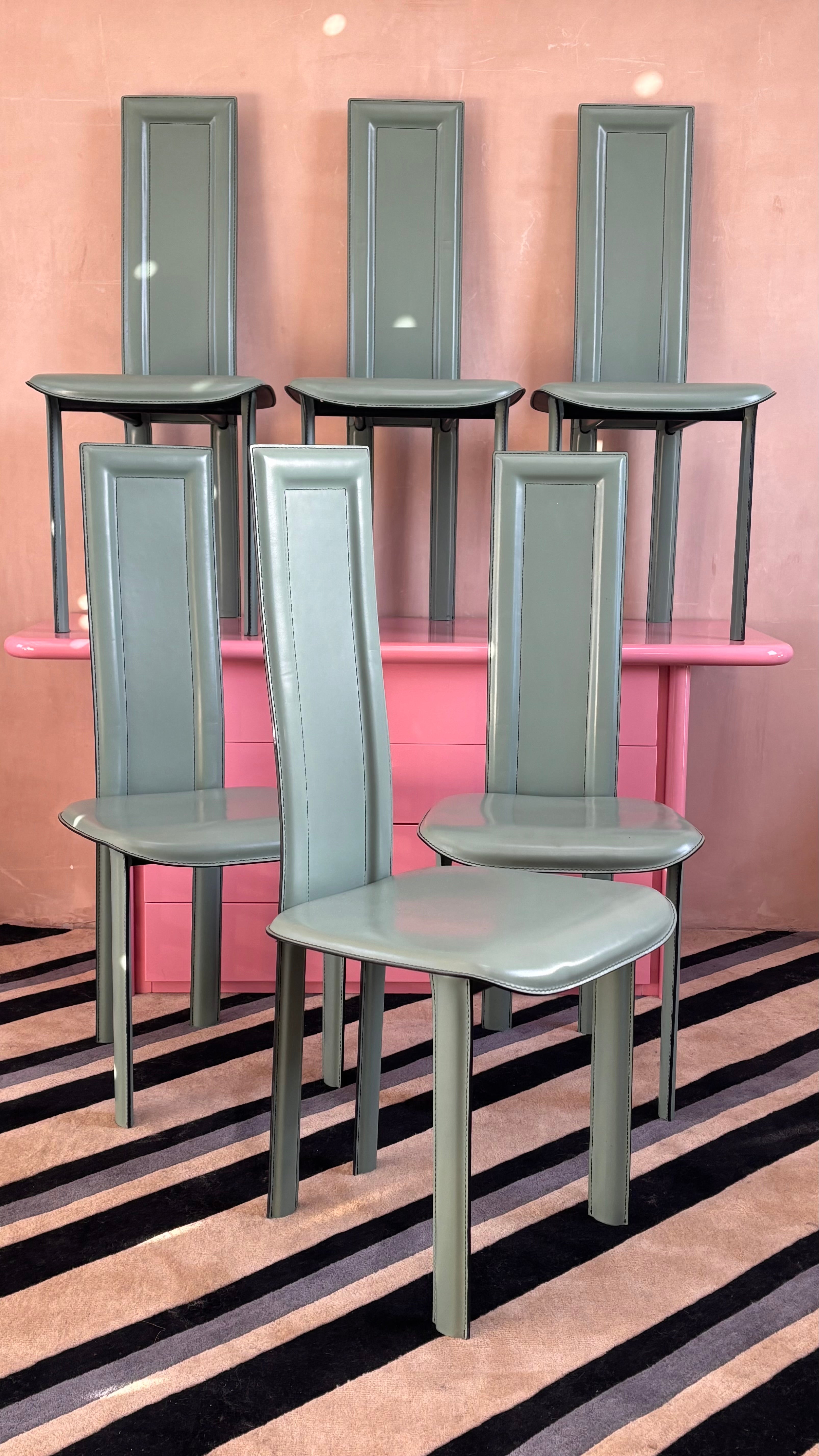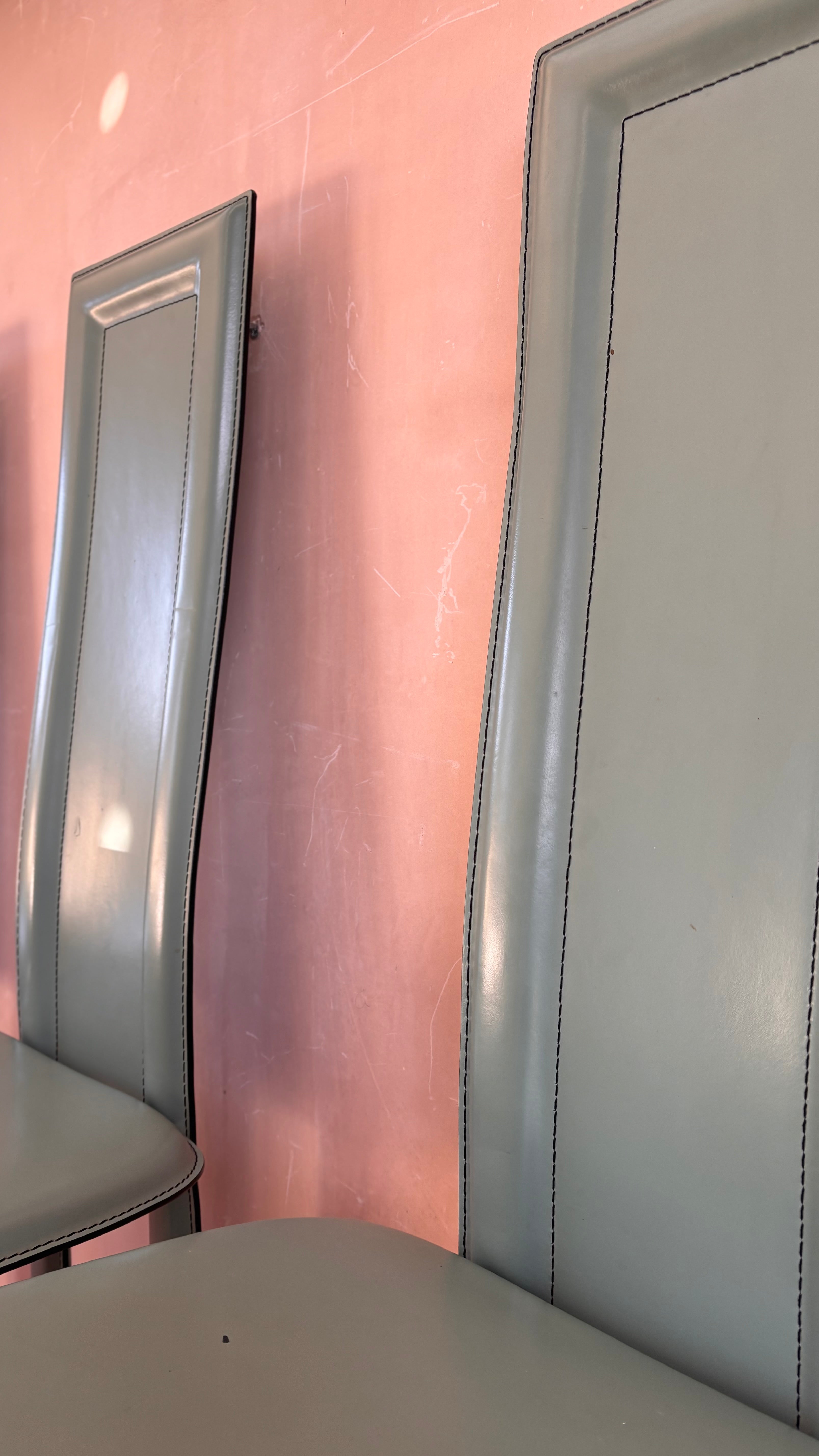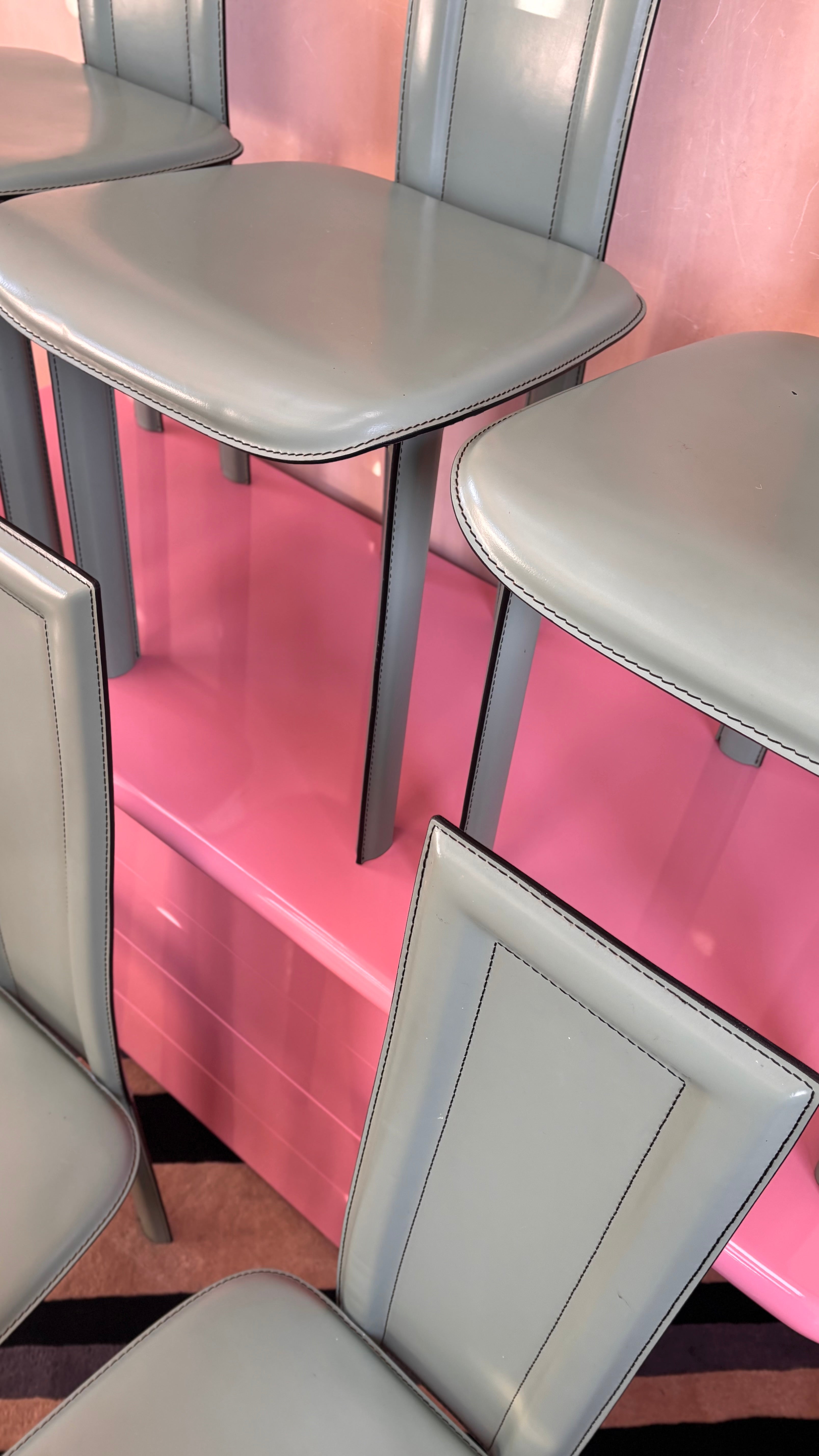 By designer Pietro Costantini. Made of thick saddle leather in eye catching mint green, expertly tailored to fit the steel frames with tall ergonomic backs & wide seats.
