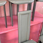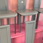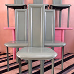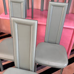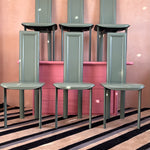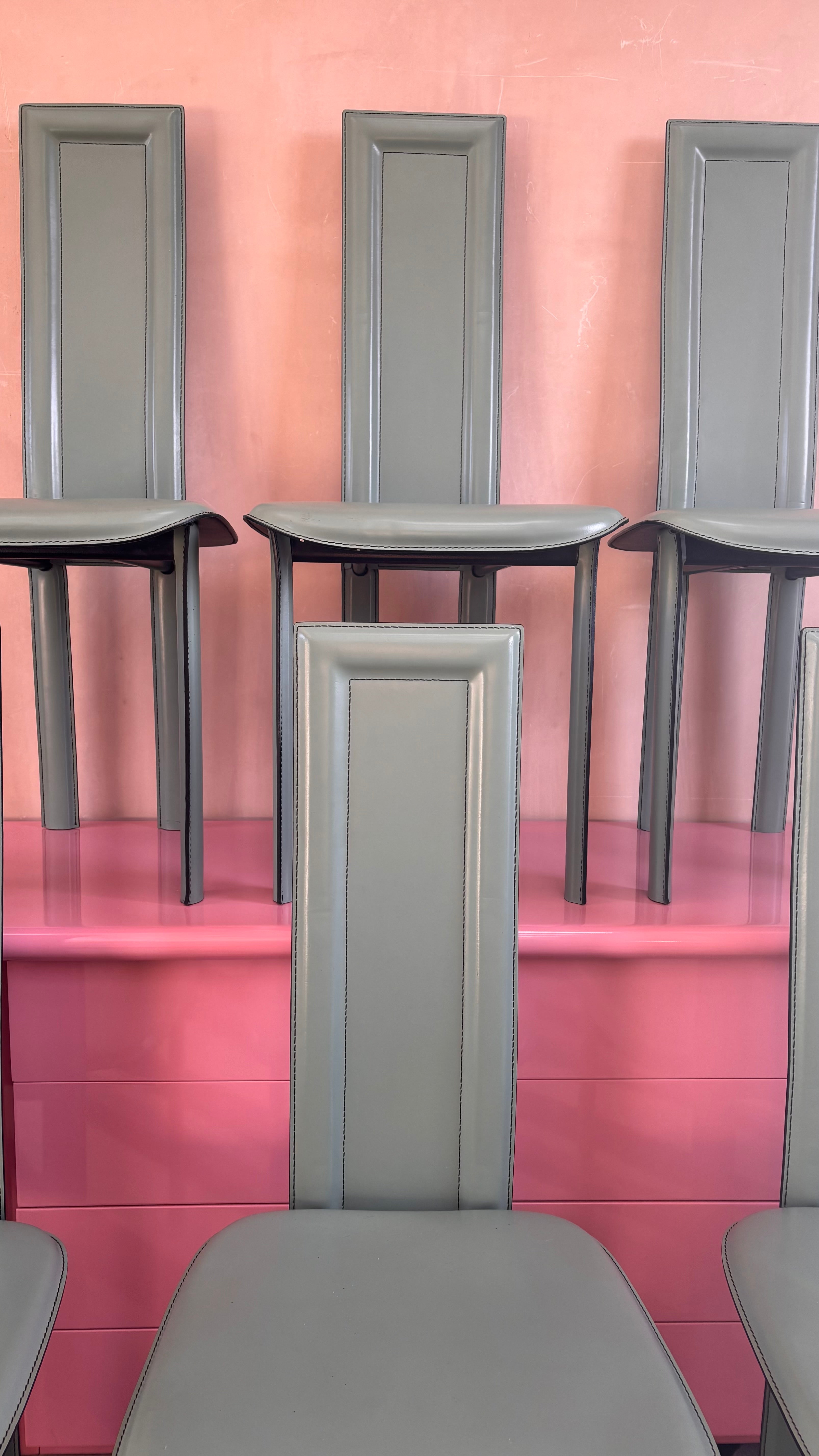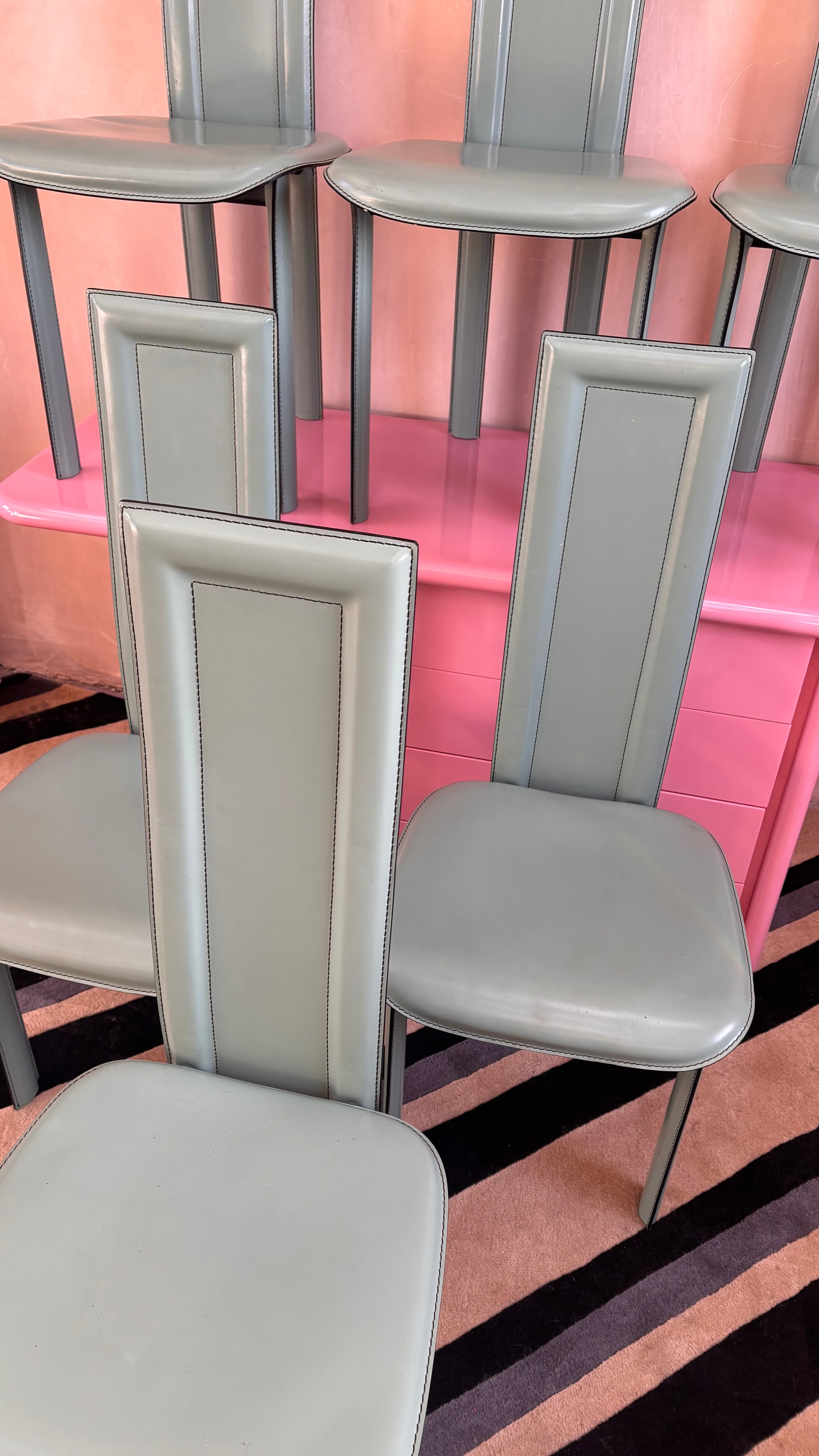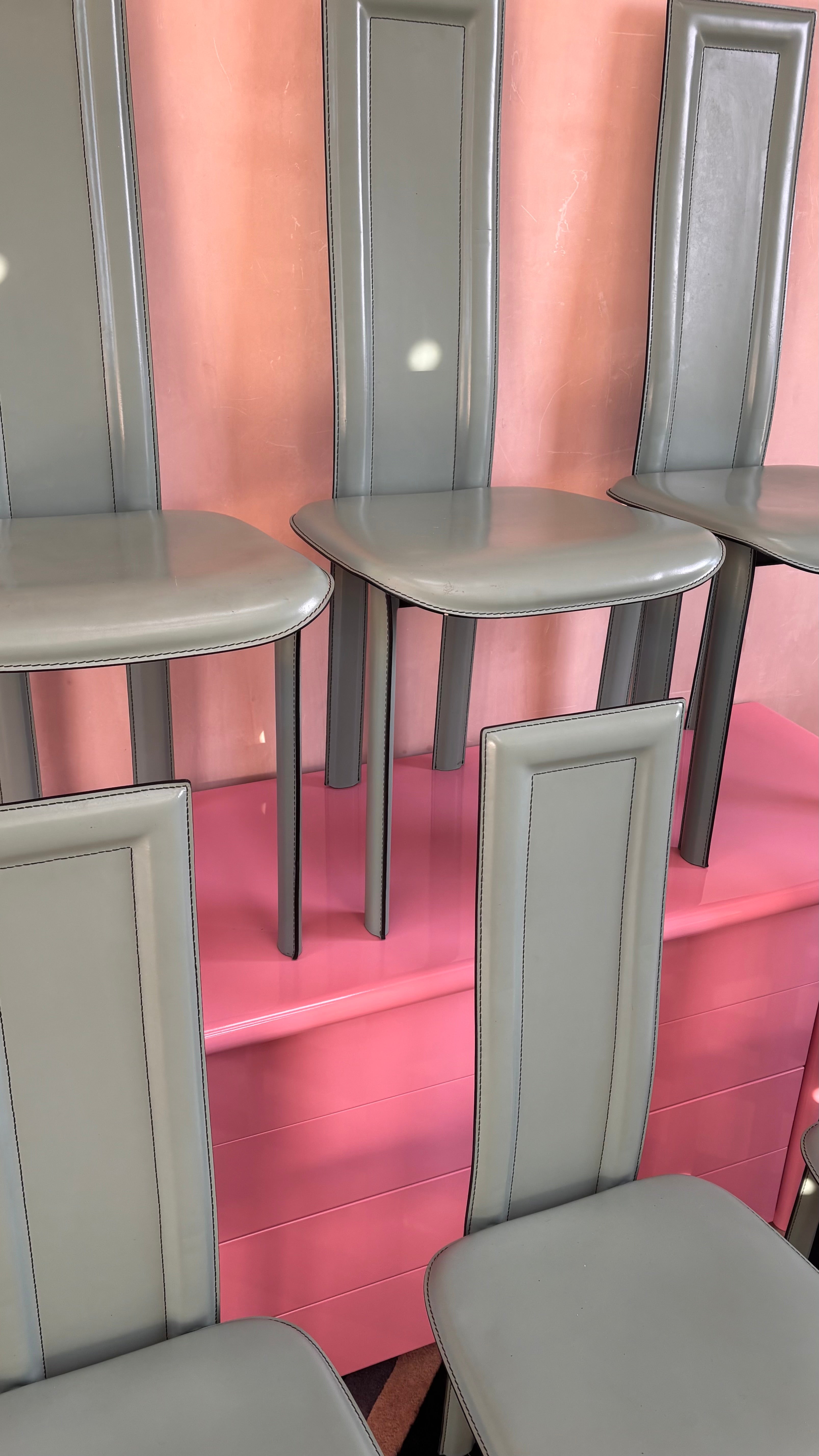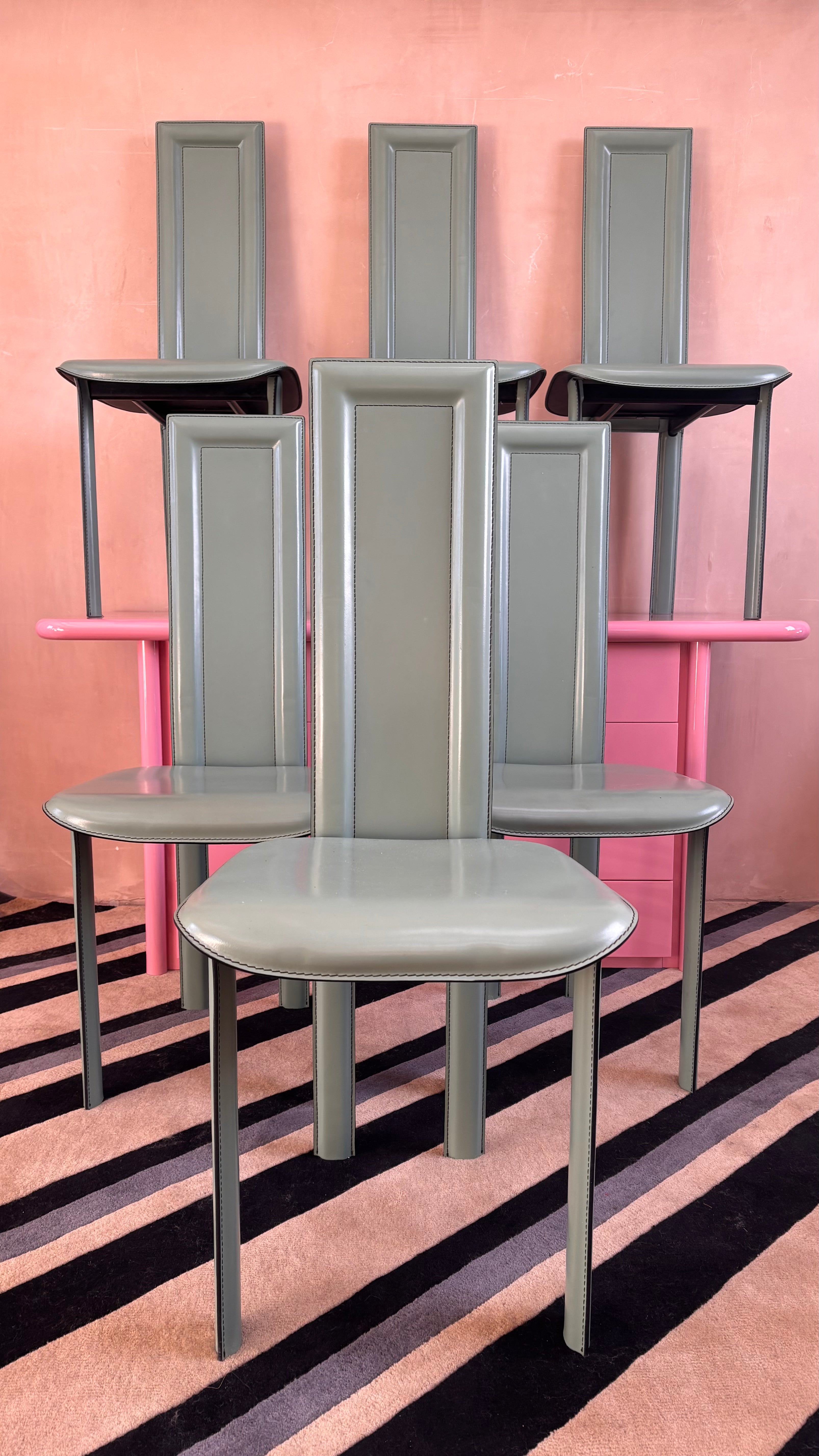 By designer Pietro Costantini. Made of thick saddle leather in eye catching mint green, expertly tailored to fit the steel frames with tall ergonomic backs & wide seats.