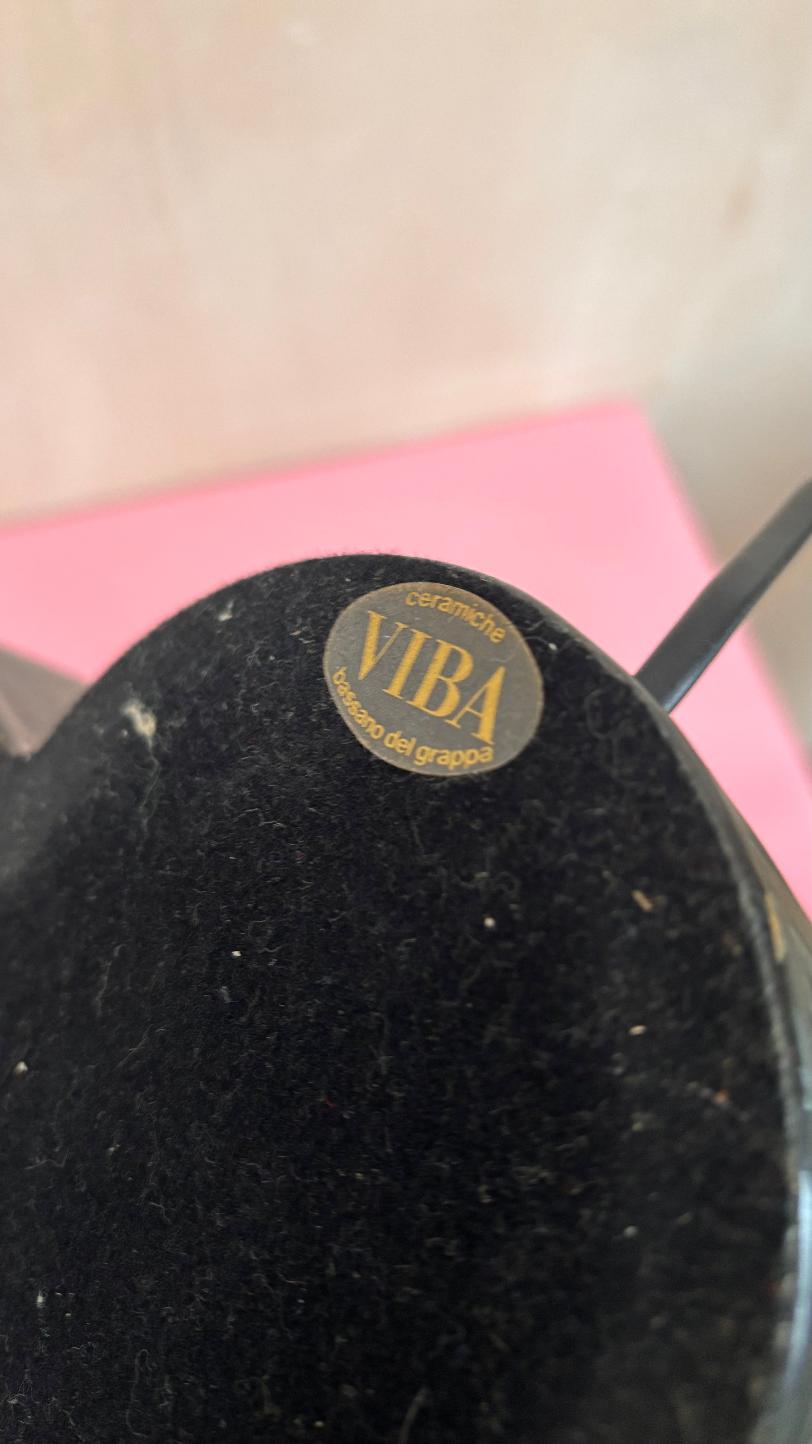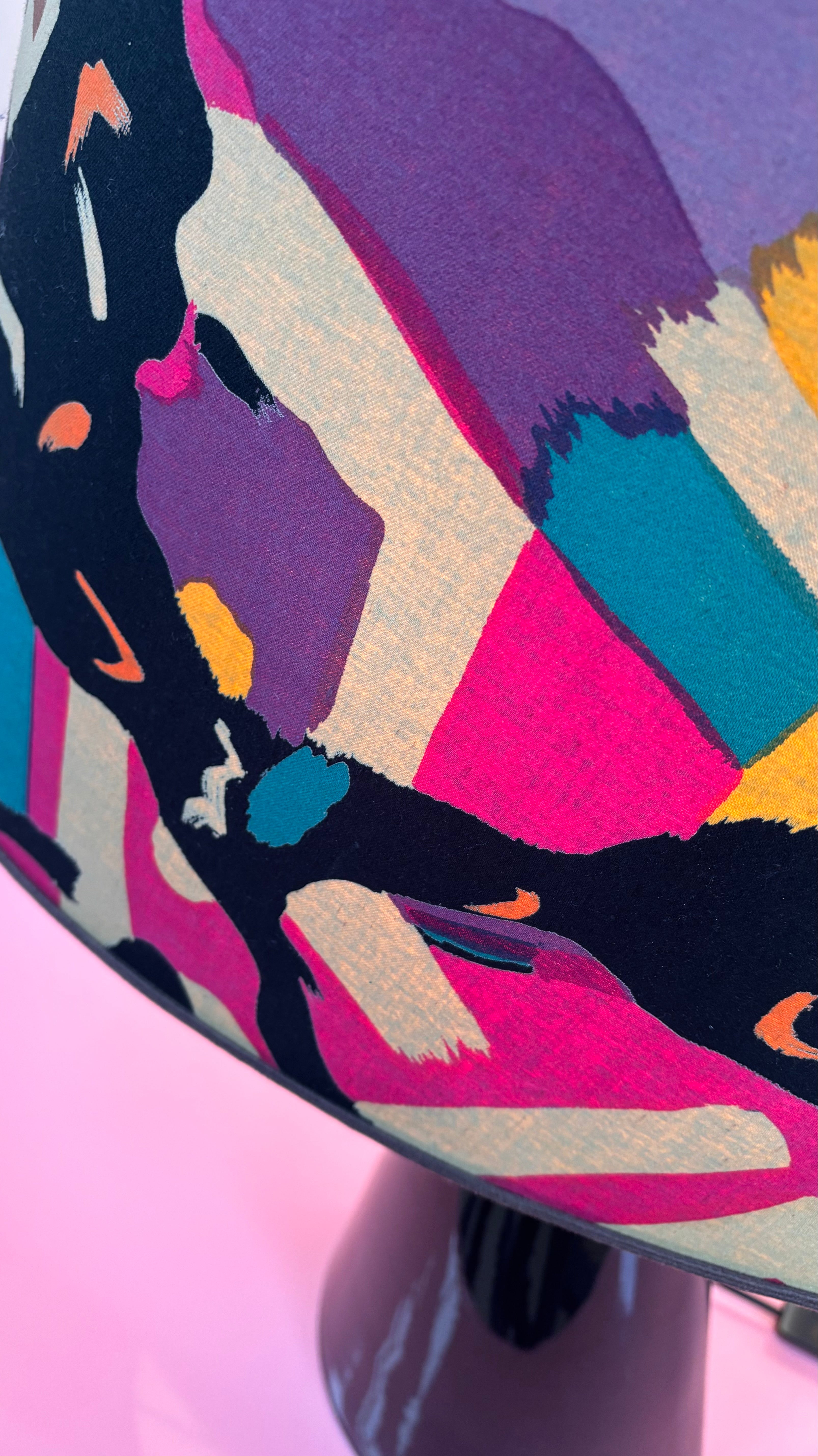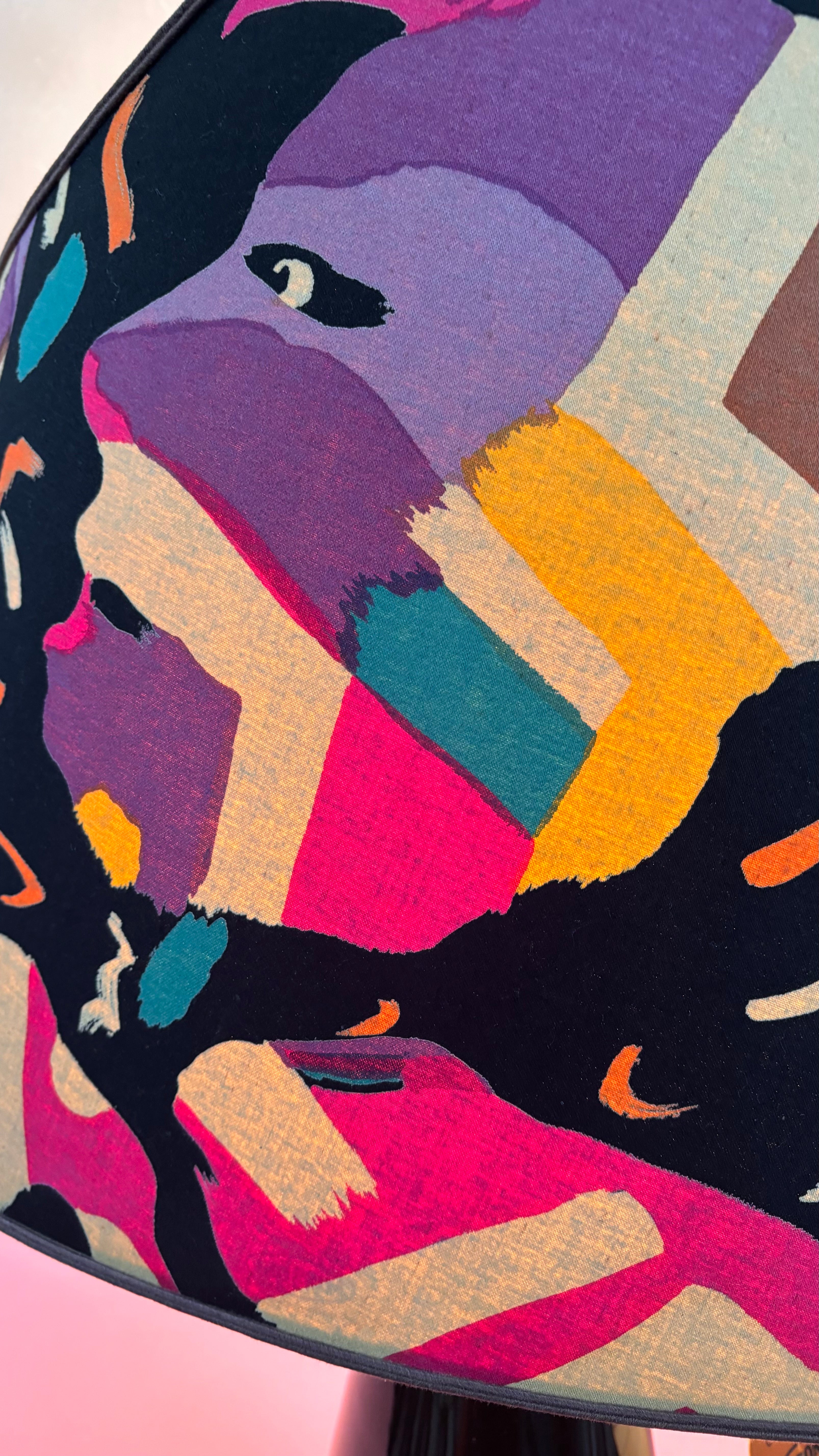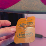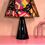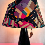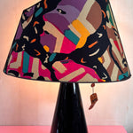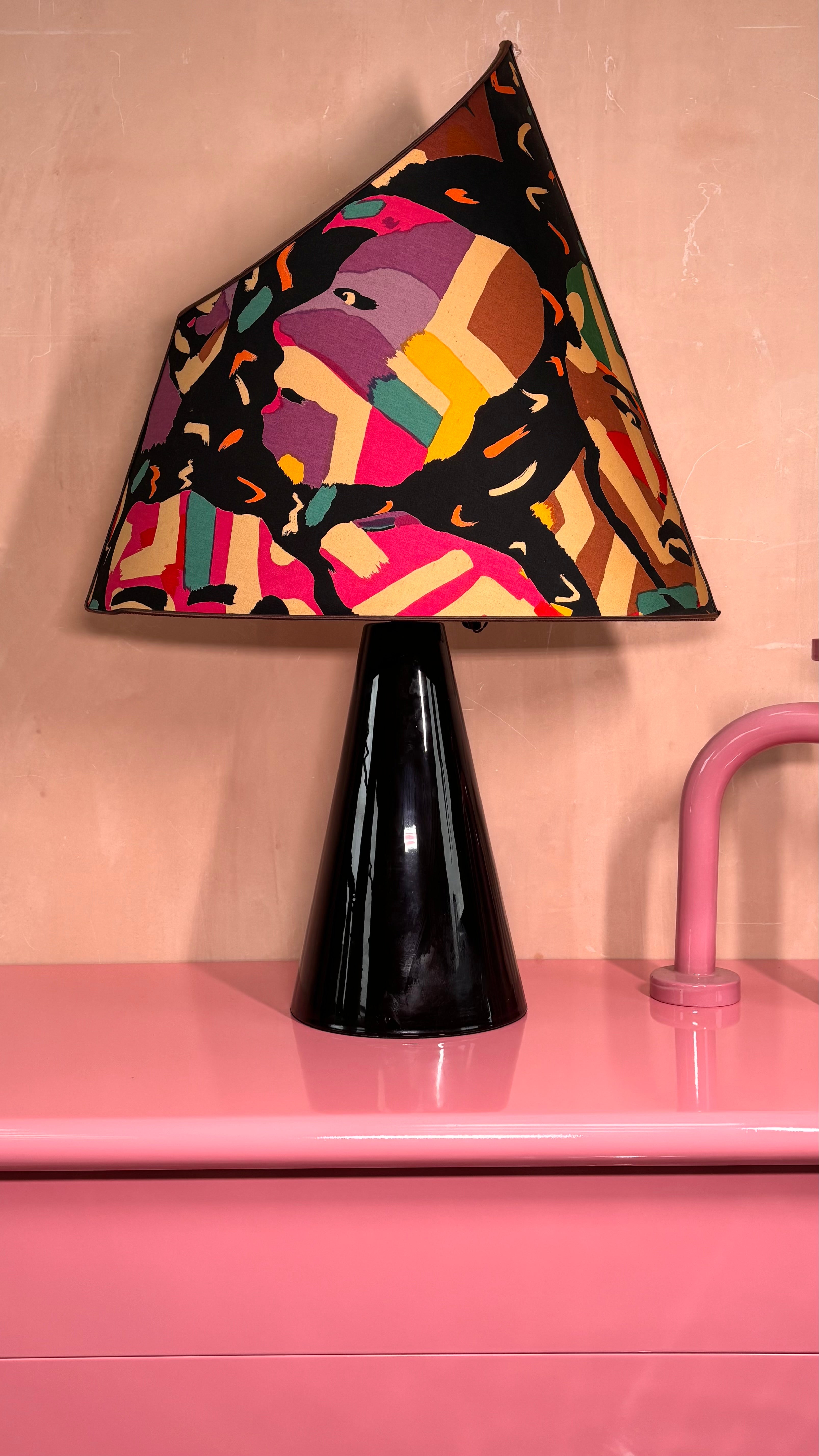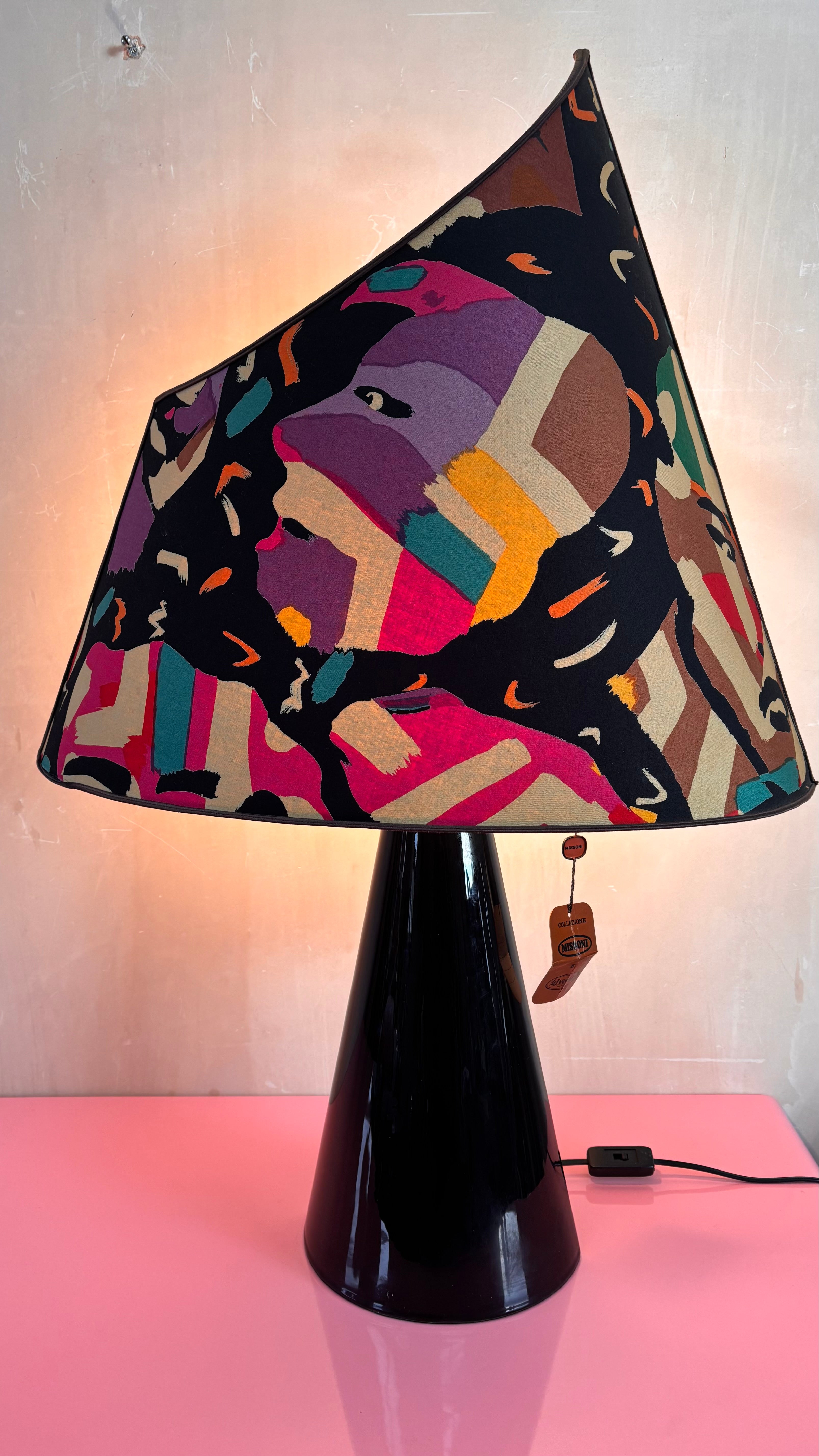 1980s rare Missoni table lamp by Massimo Valloto. These are so hard to find in this condition. Very decorative large fabric shade, sits on a glossy ceramic black conical shape base.