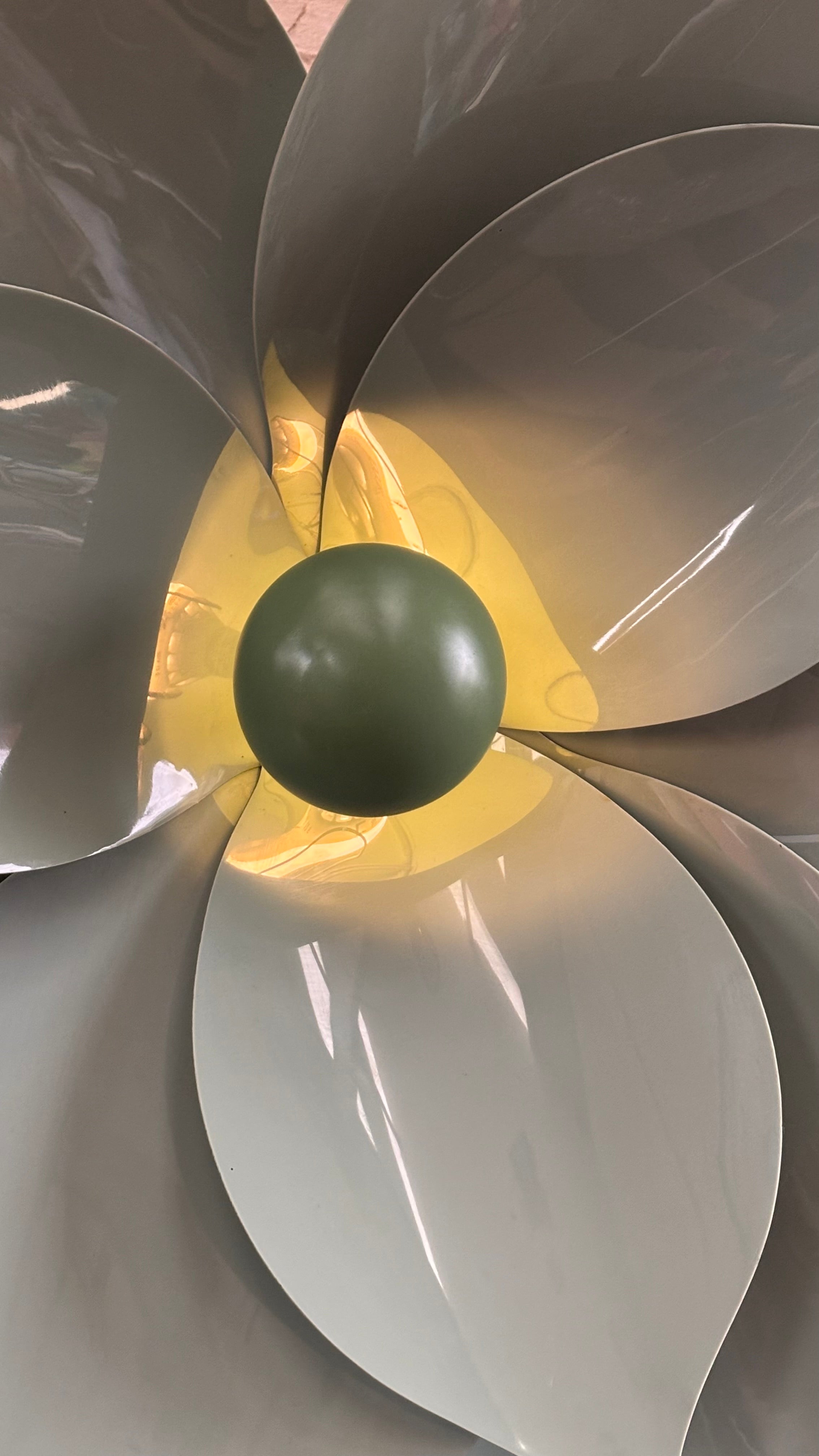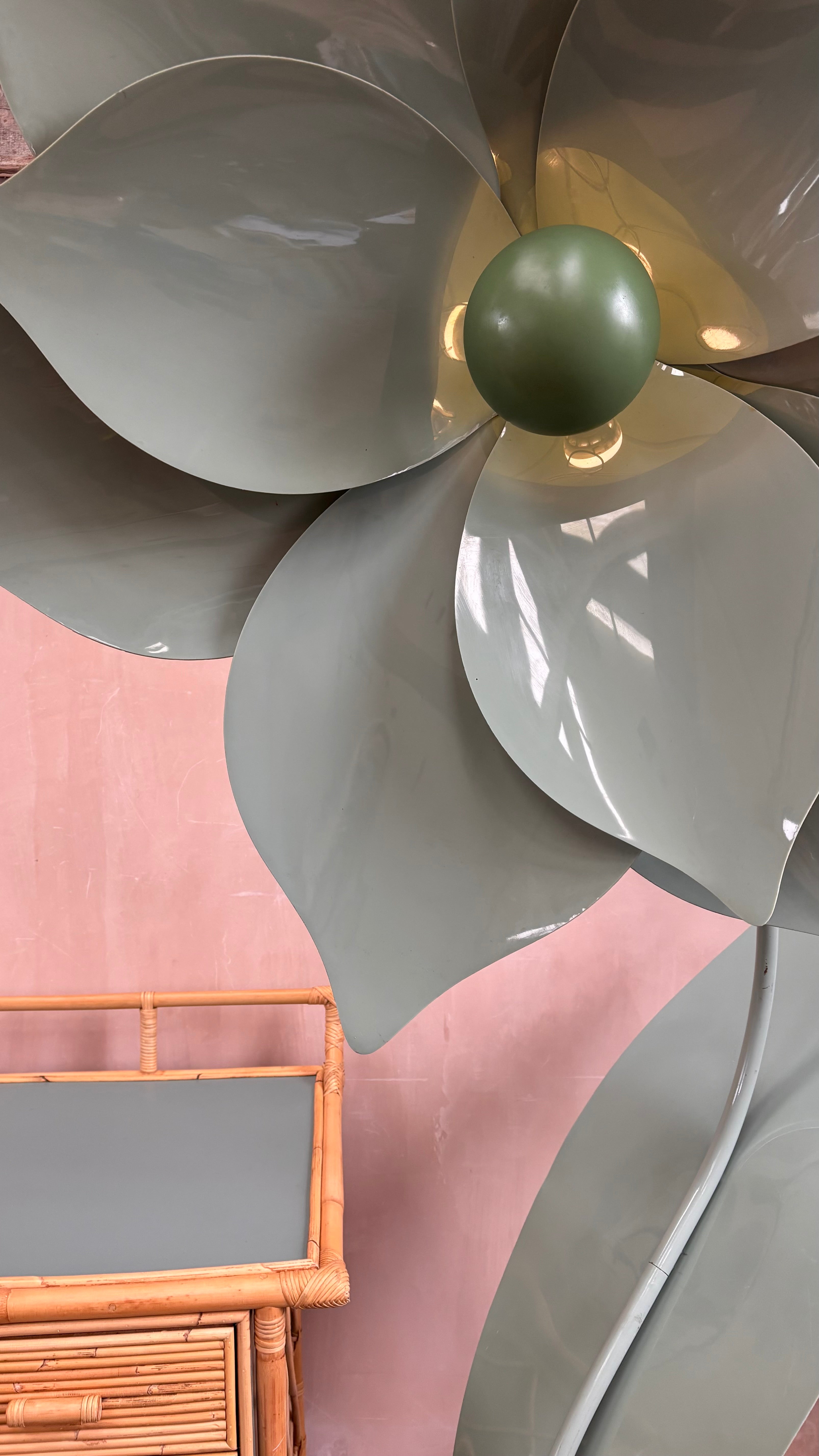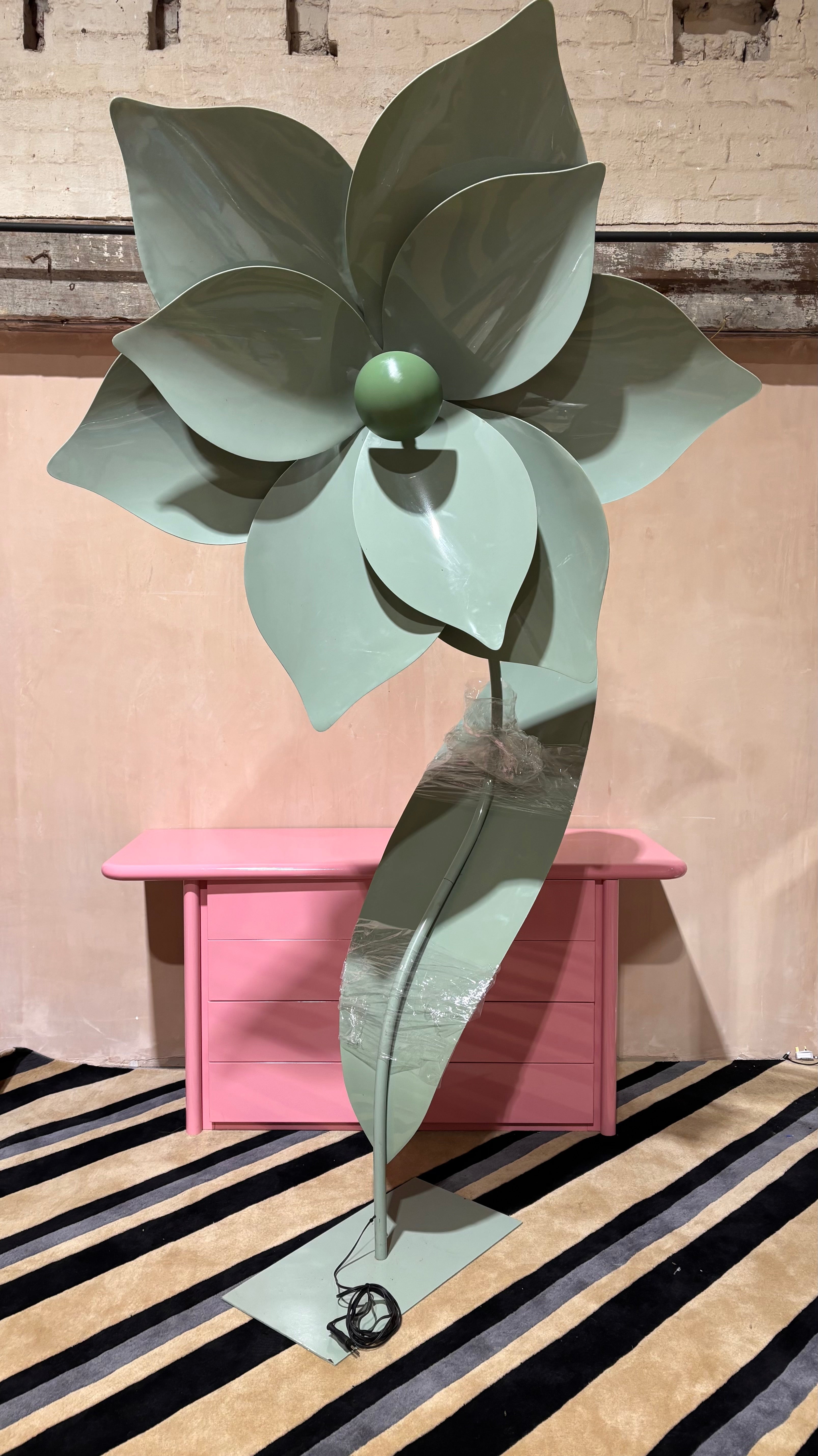 The base and the stem are powder coated iron. The sage green flower is coloured lucite. Flower top comes off the main metal post for transport. Floor switch for lighting. Center of the flower holds a bulb which lets off a very subtle glow.