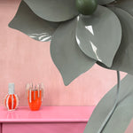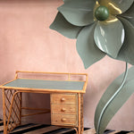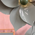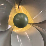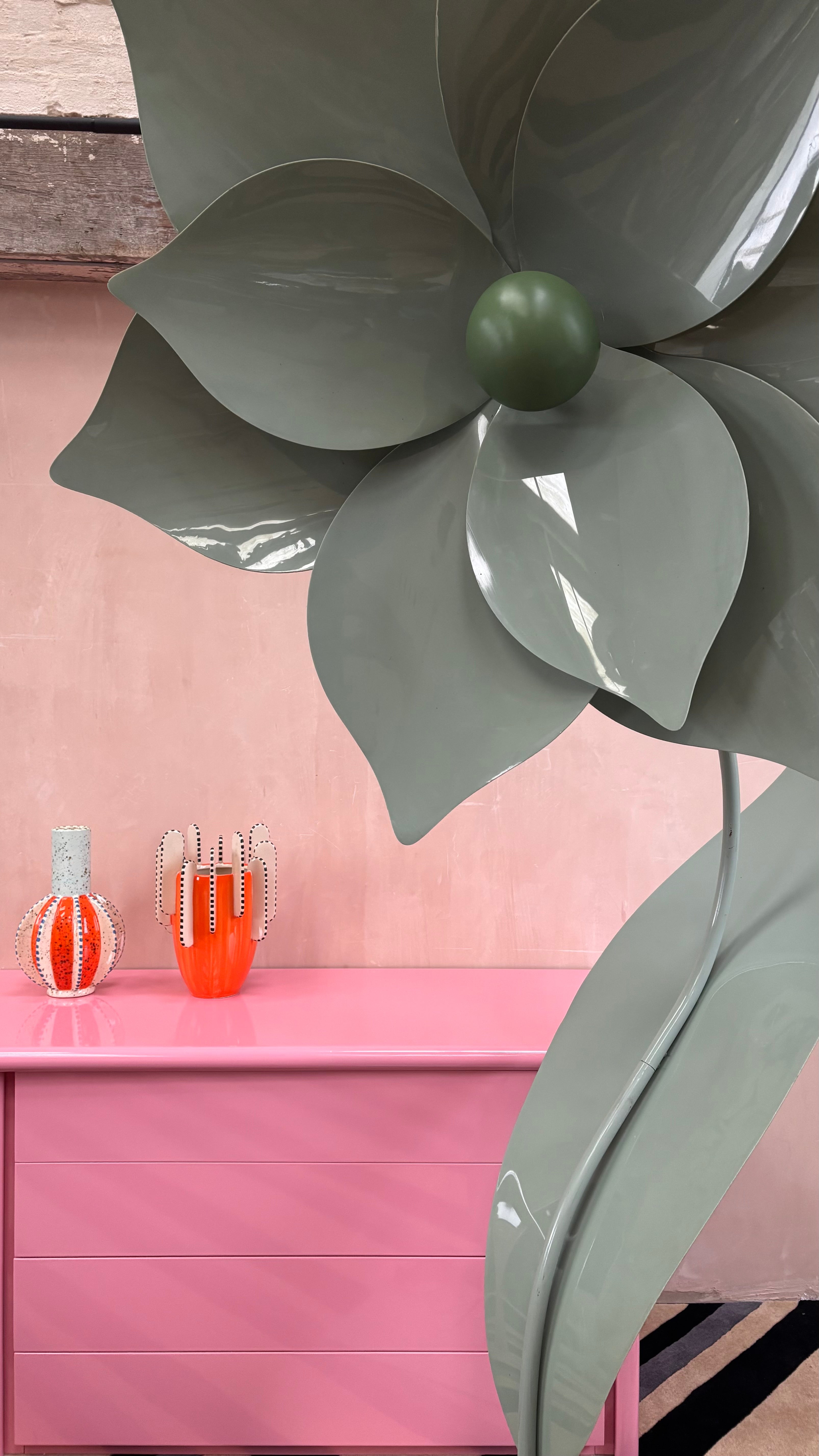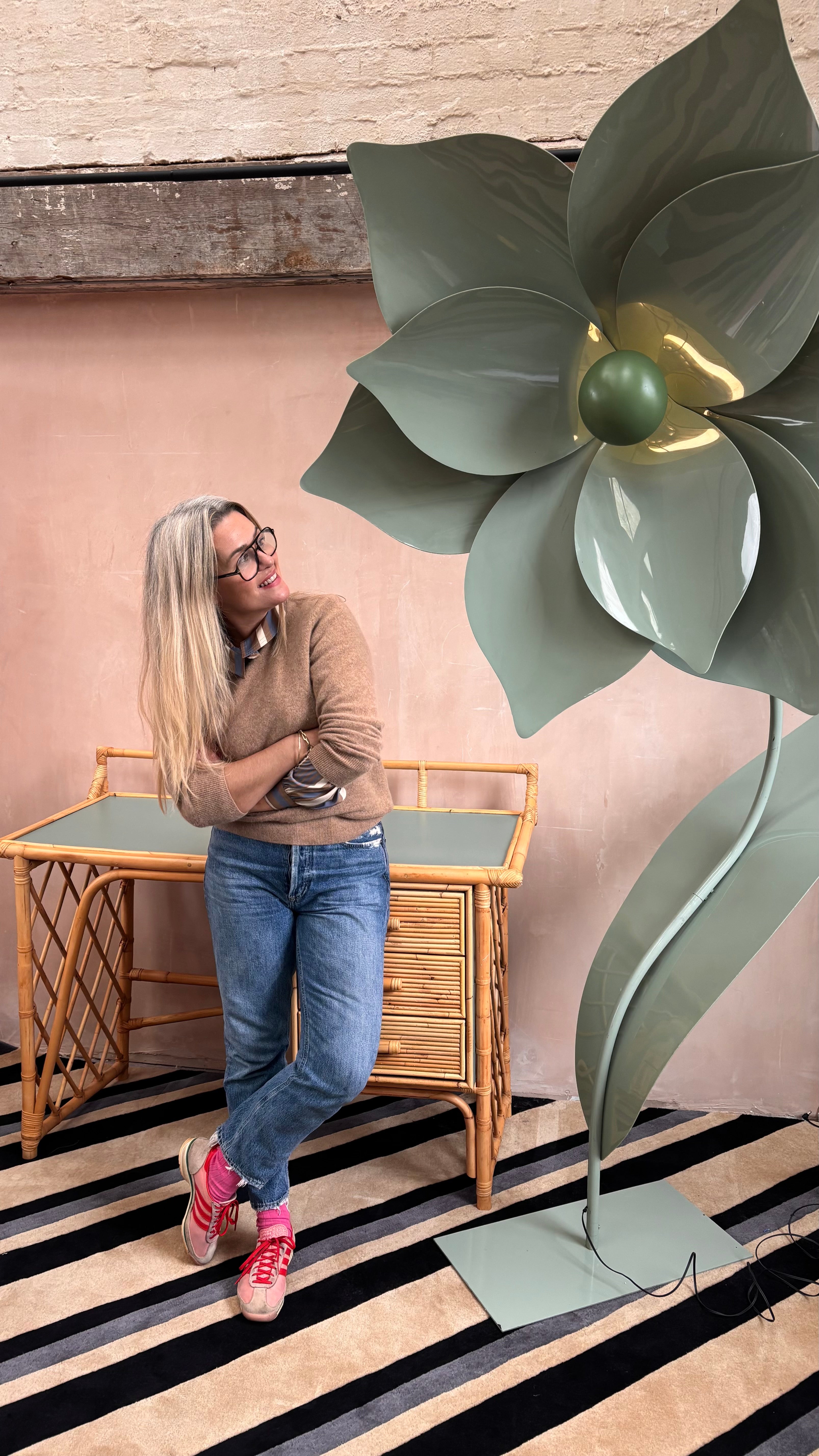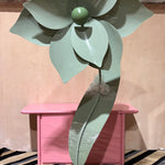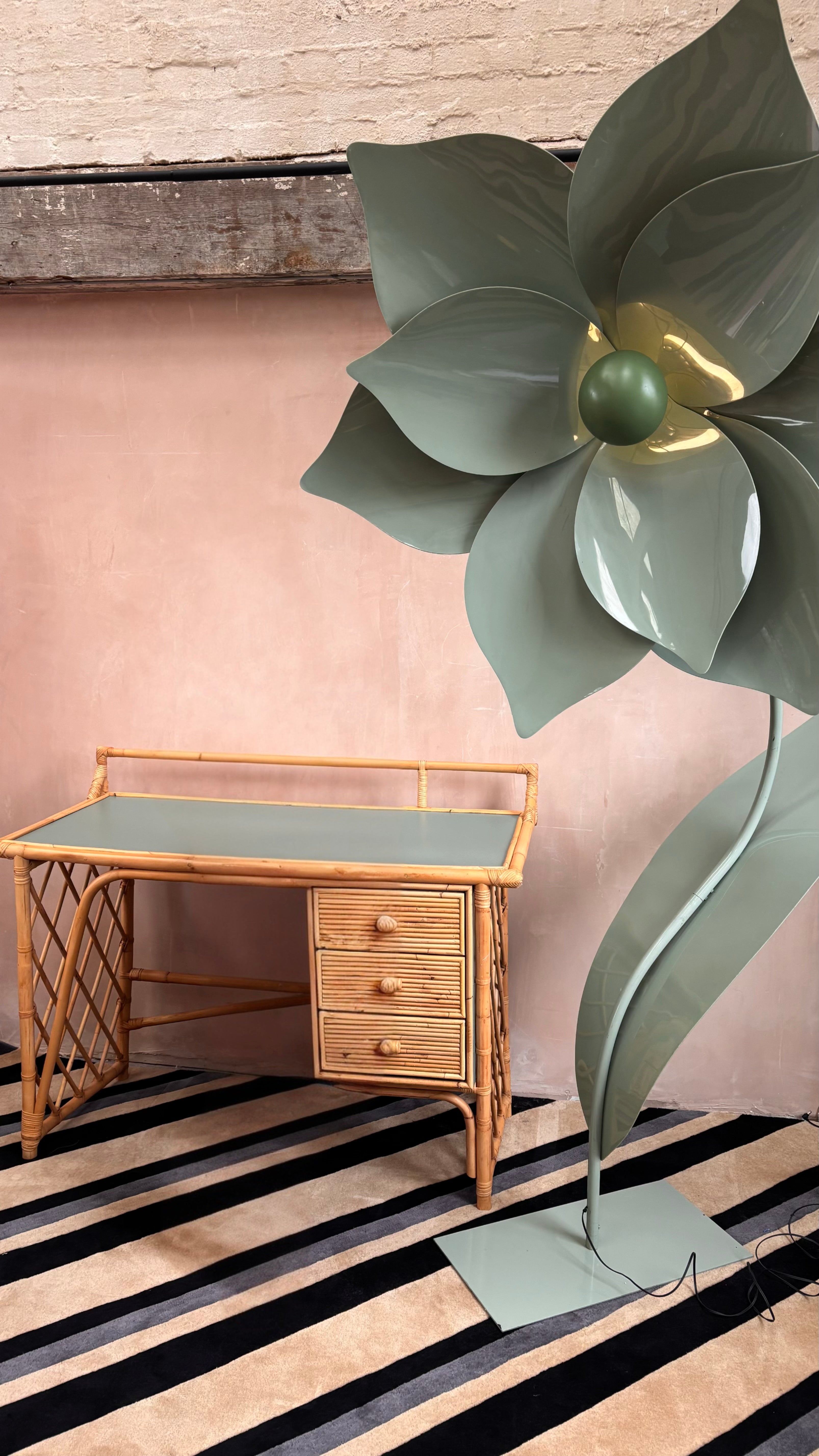 The base and the stem are powder coated iron. The sage green flower is coloured lucite. Flower top comes off the main metal post for transport. Floor switch for lighting. Center of the flower holds a bulb which lets off a very subtle glow.