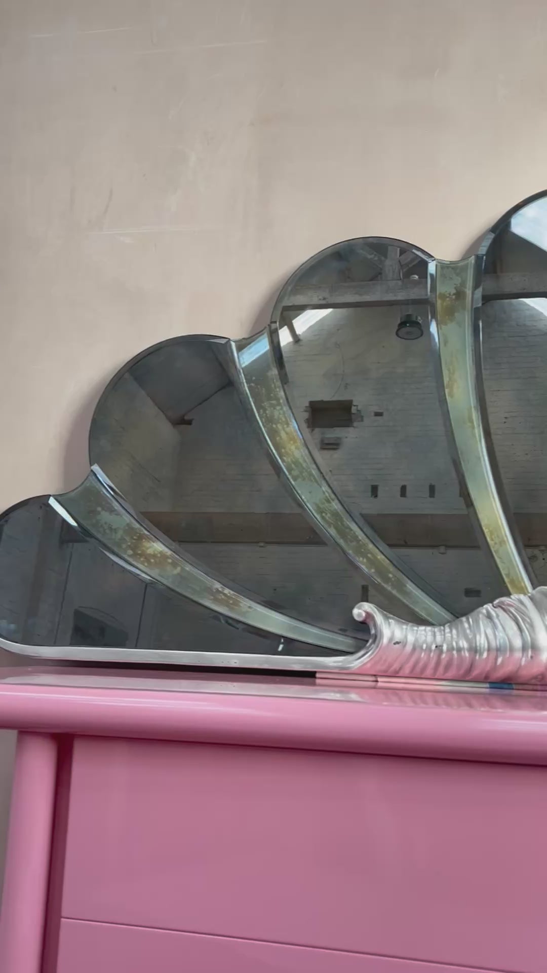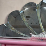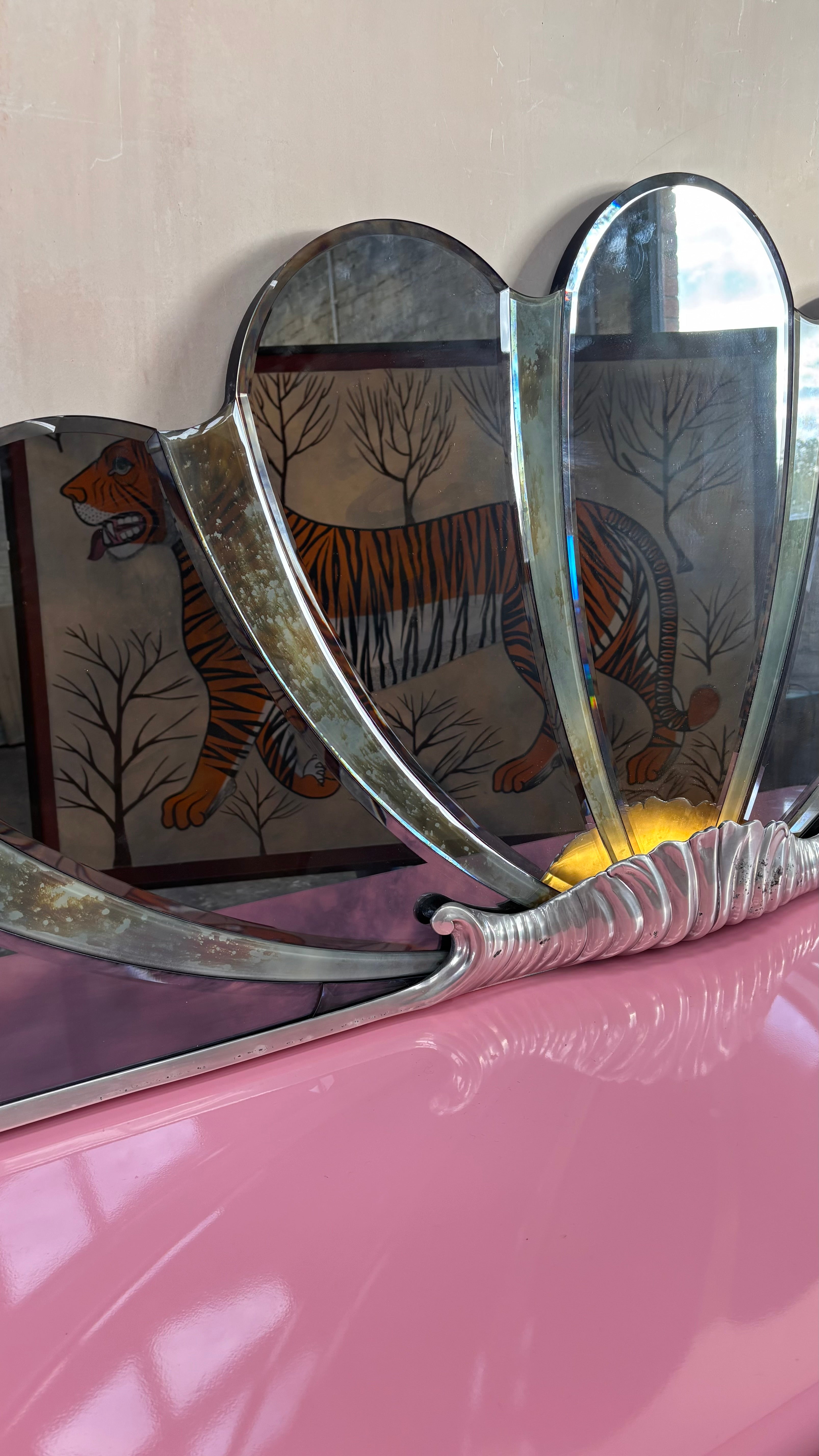 Wonderful 1980s Italian large shell shape mirror with glowing center. Foxed mirror panels in the shape of a shell secured with a large chrome scroll to the front which allows for a bulb. It give a very subtle light.