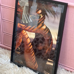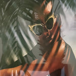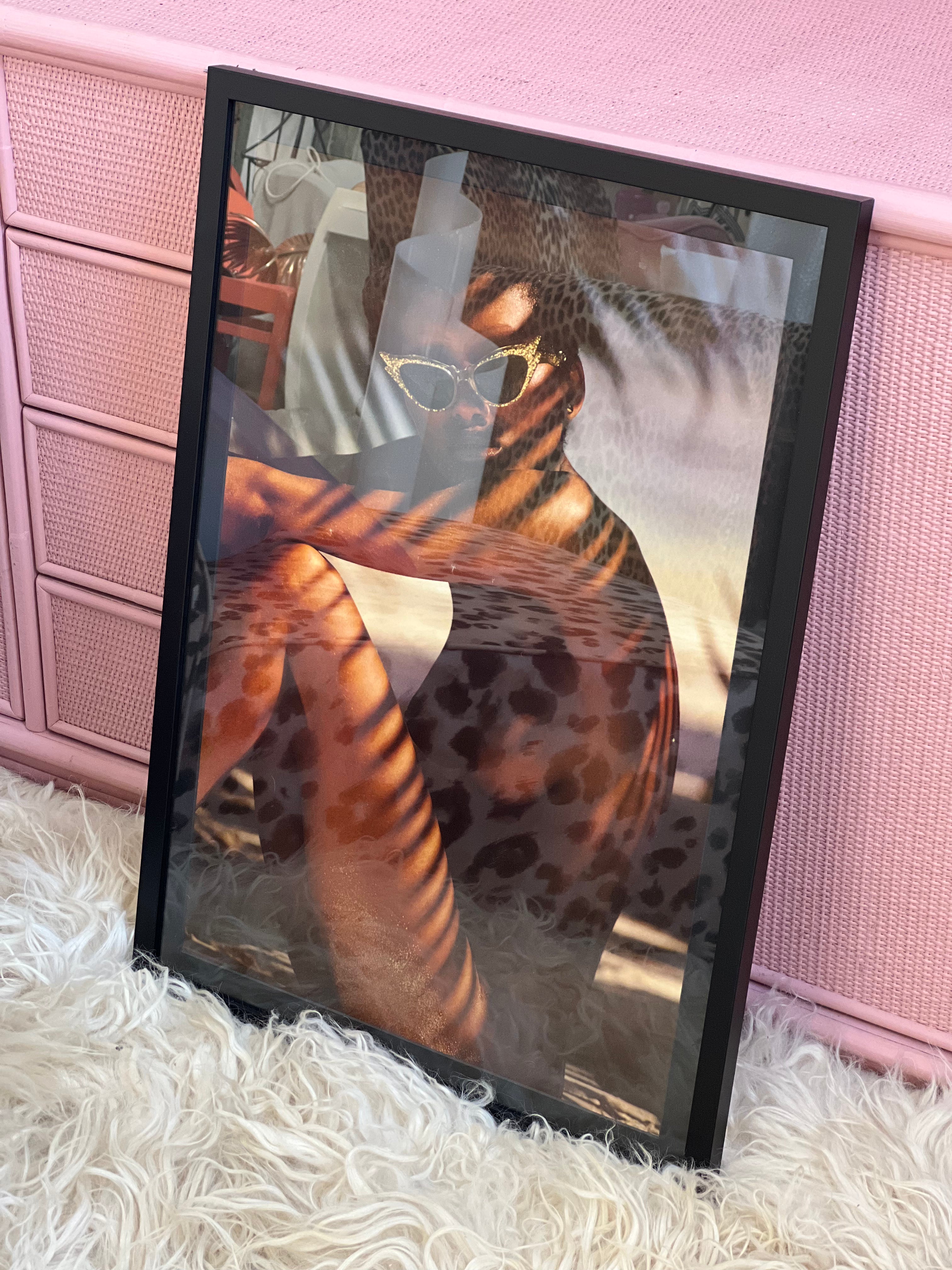 Here the shadows cast by palm trees overhead look like zebra stripes on model Marana's bare skin.