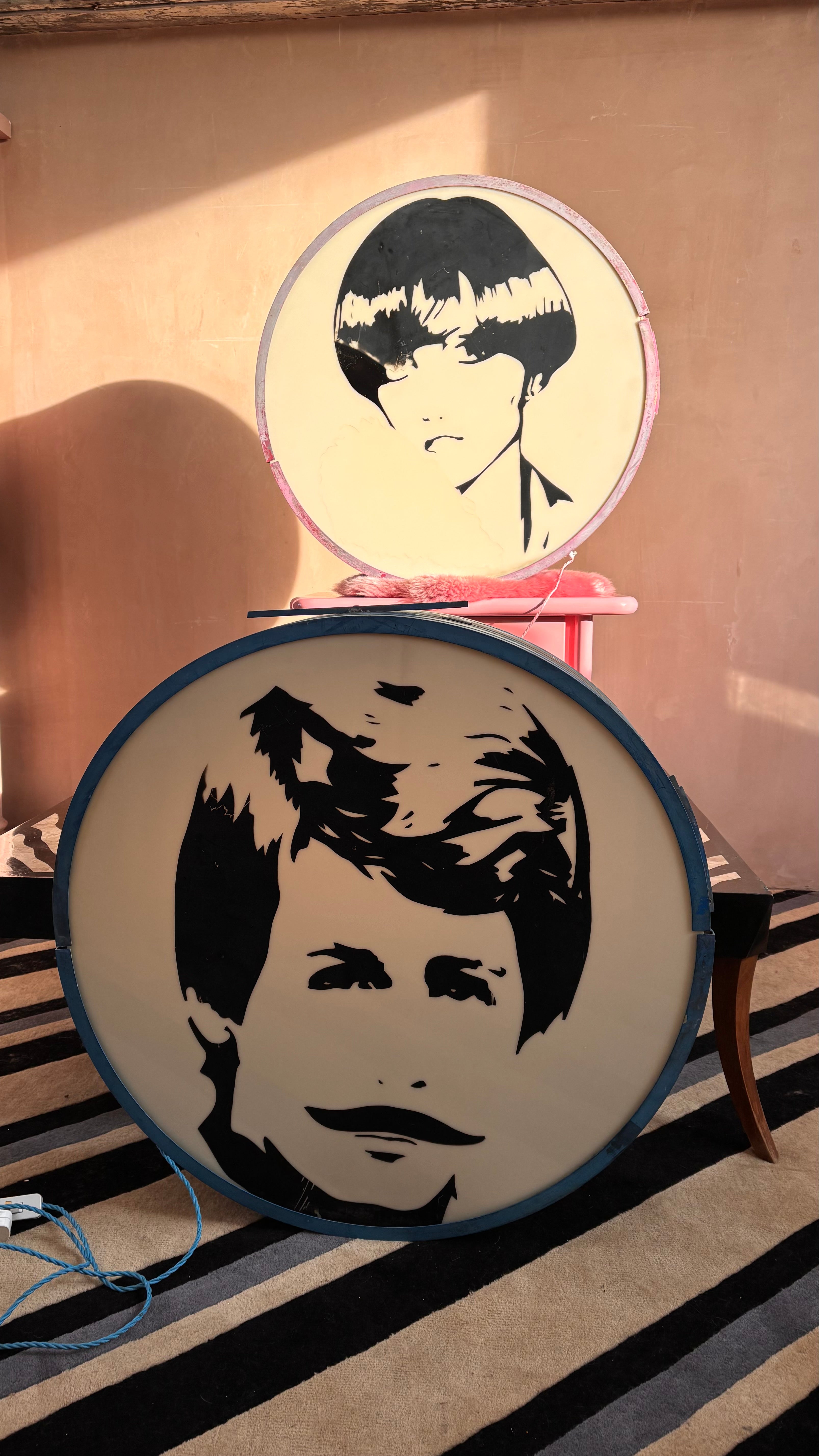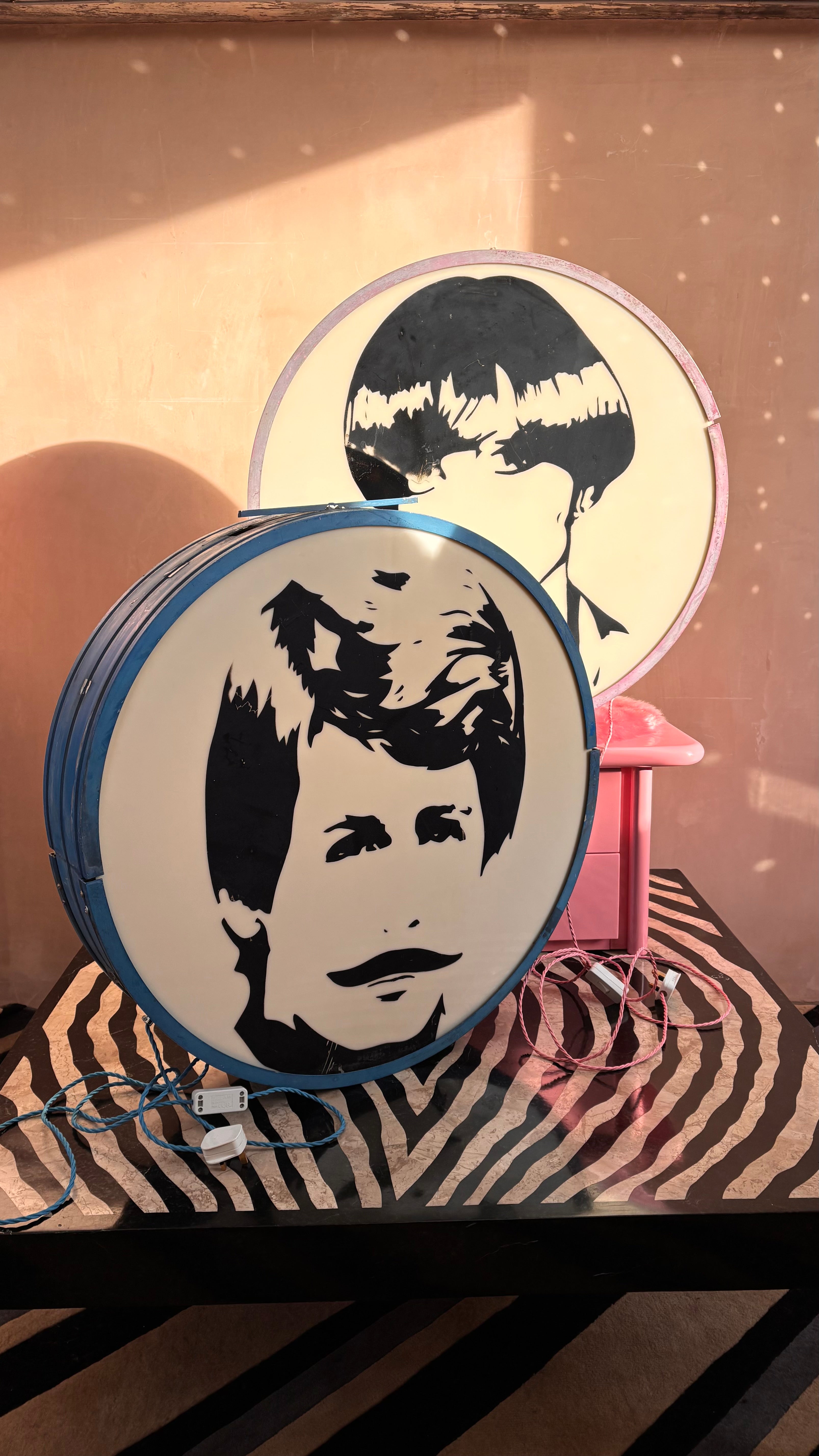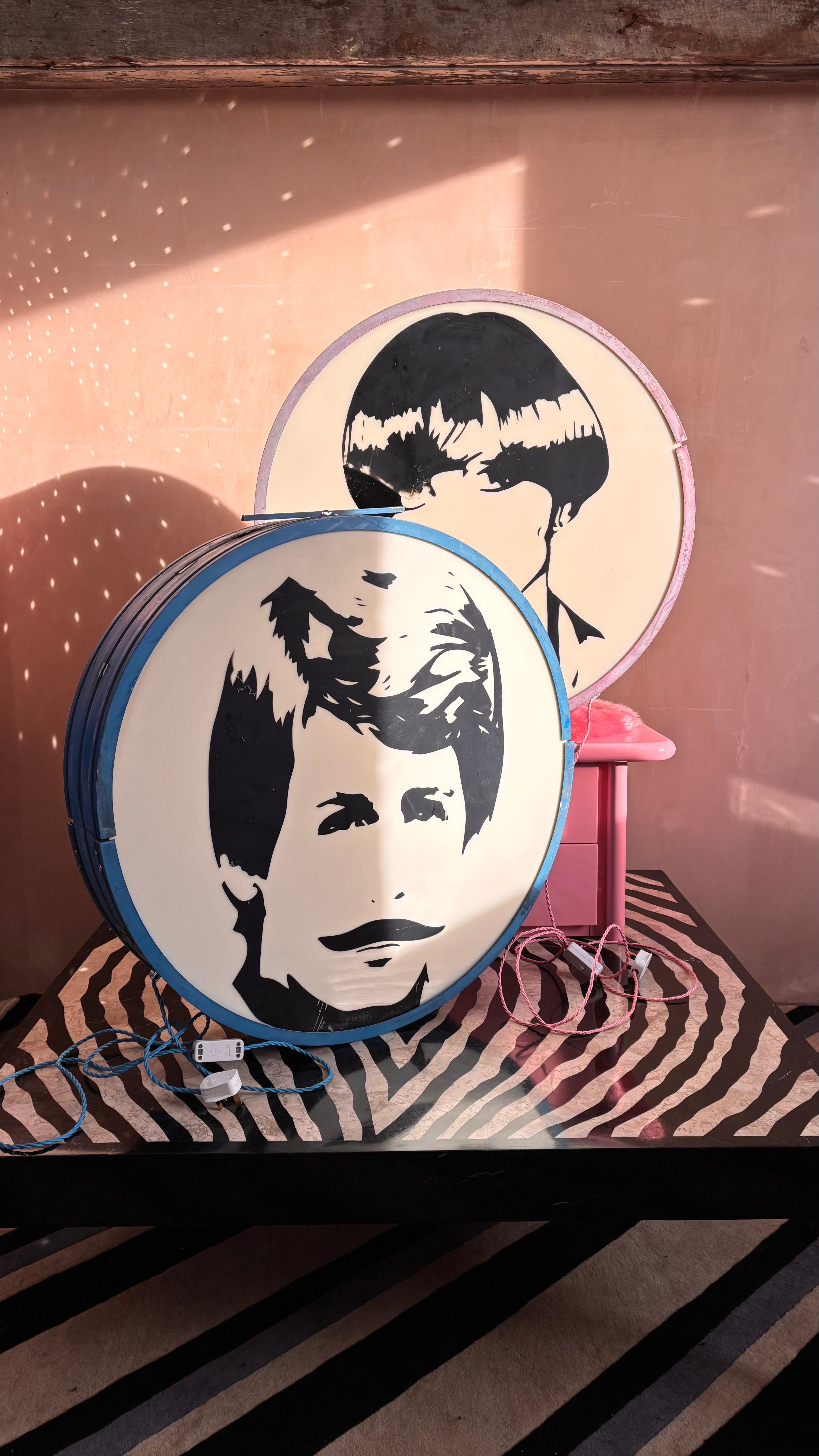 Spectacular 1960s original Italian hair salon illuminated signs. These were once joined by a metal pole and attached to a wall of a hair salon in Florence. Then hidden behind rubble for years until Anemone spotted them.