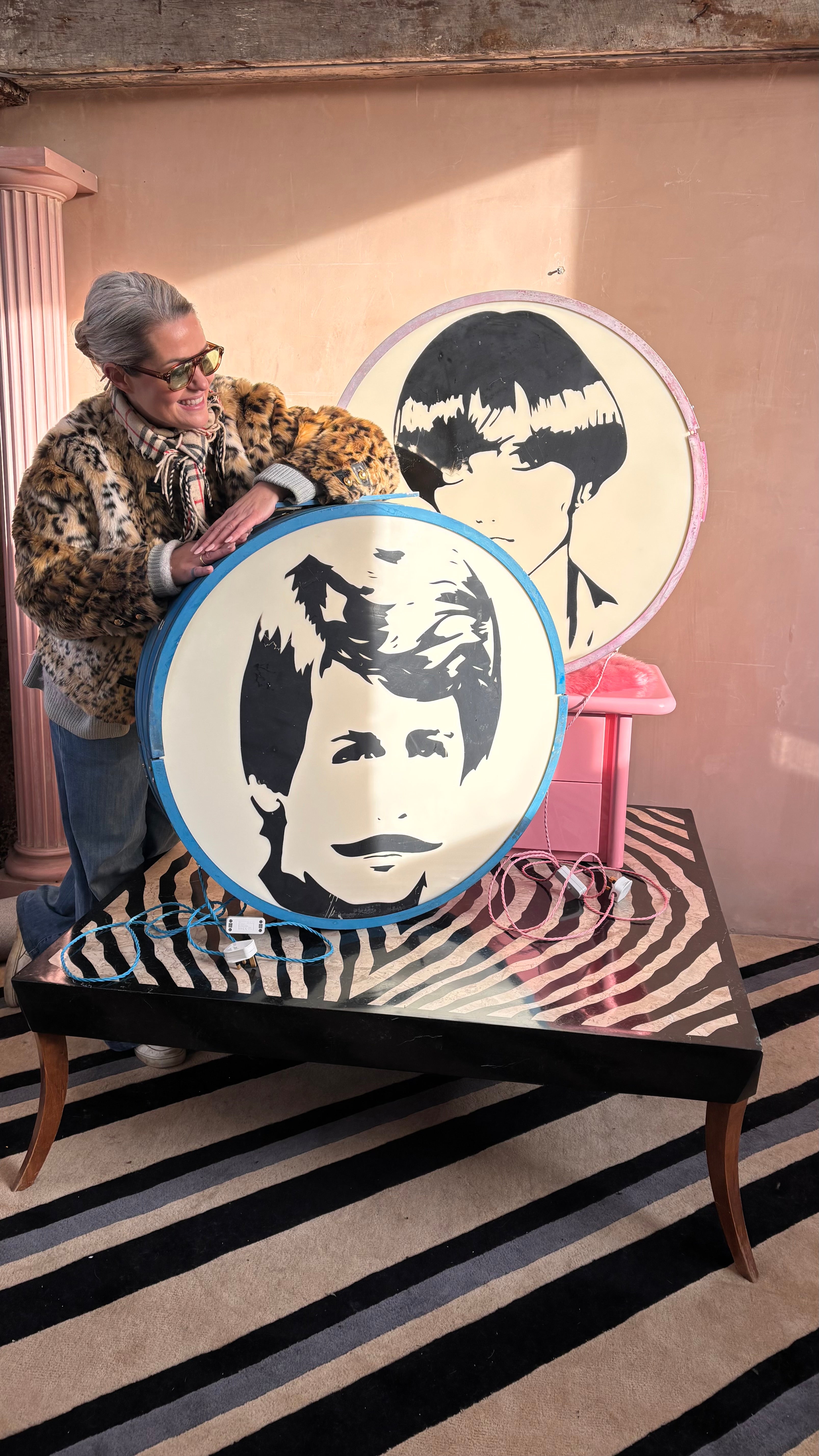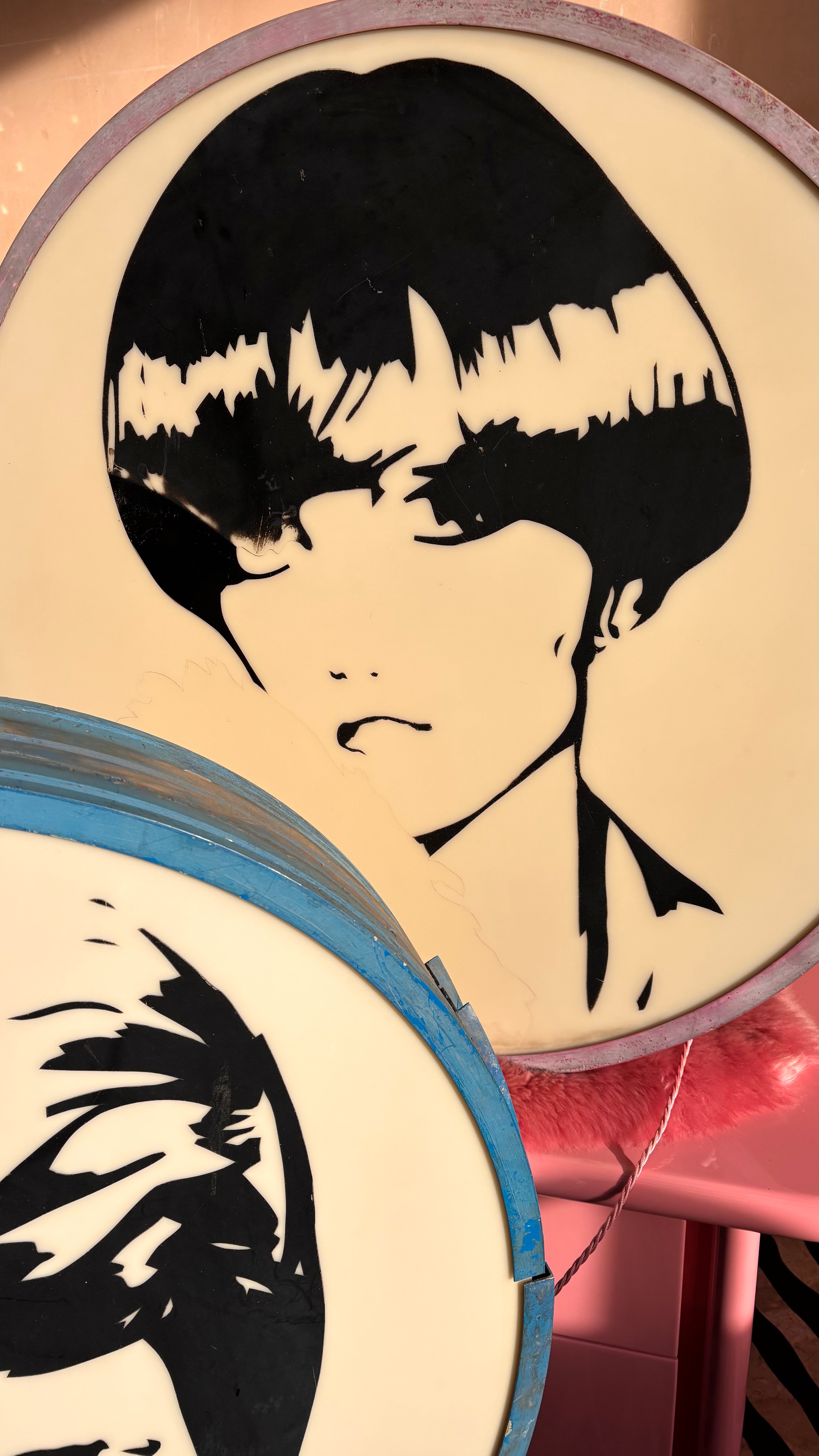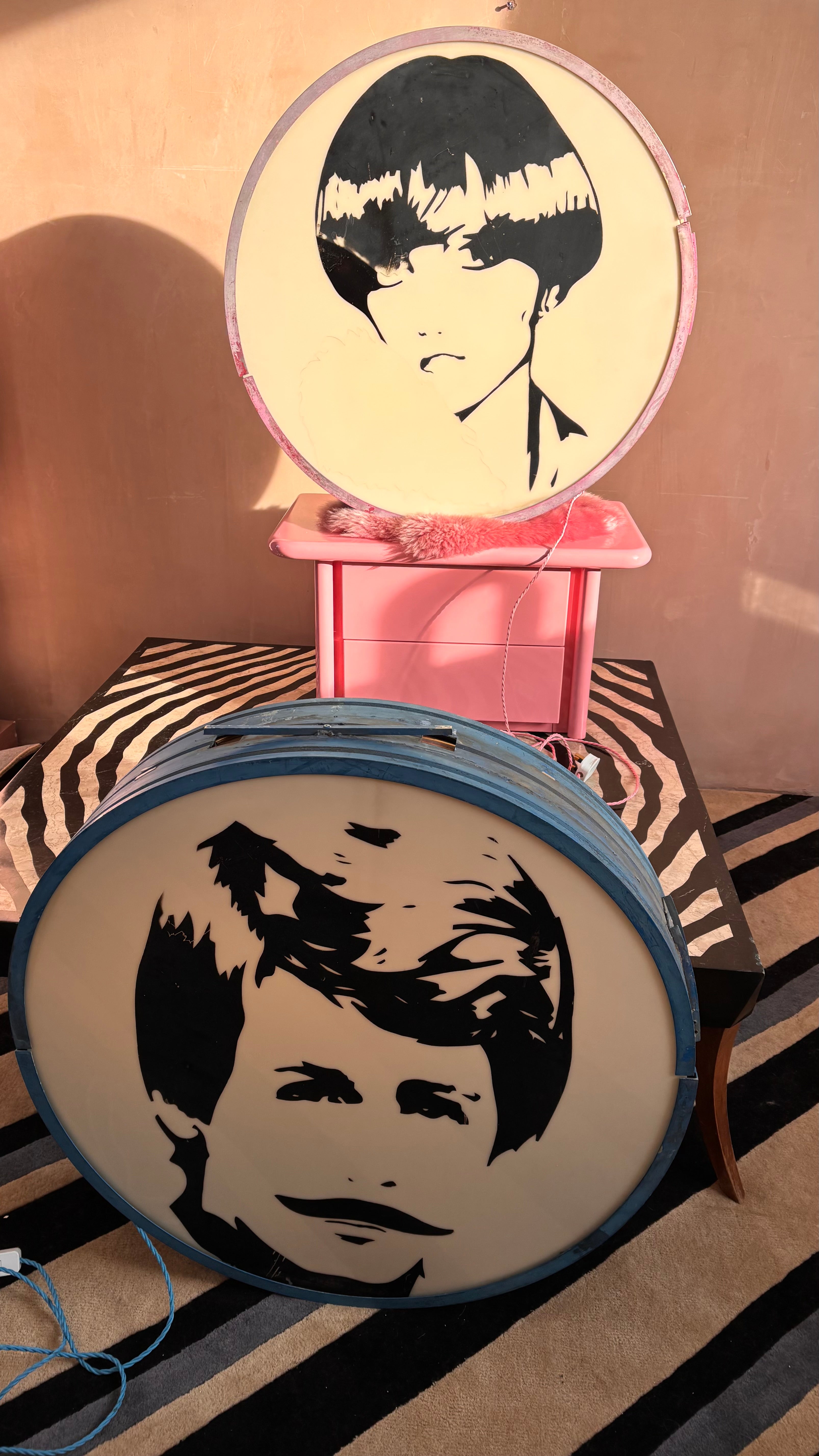 Spectacular 1960s original Italian hair salon illuminated signs. These were once joined by a metal pole and attached to a wall of a hair salon in Florence. Then hidden behind rubble for years until Anemone spotted them.