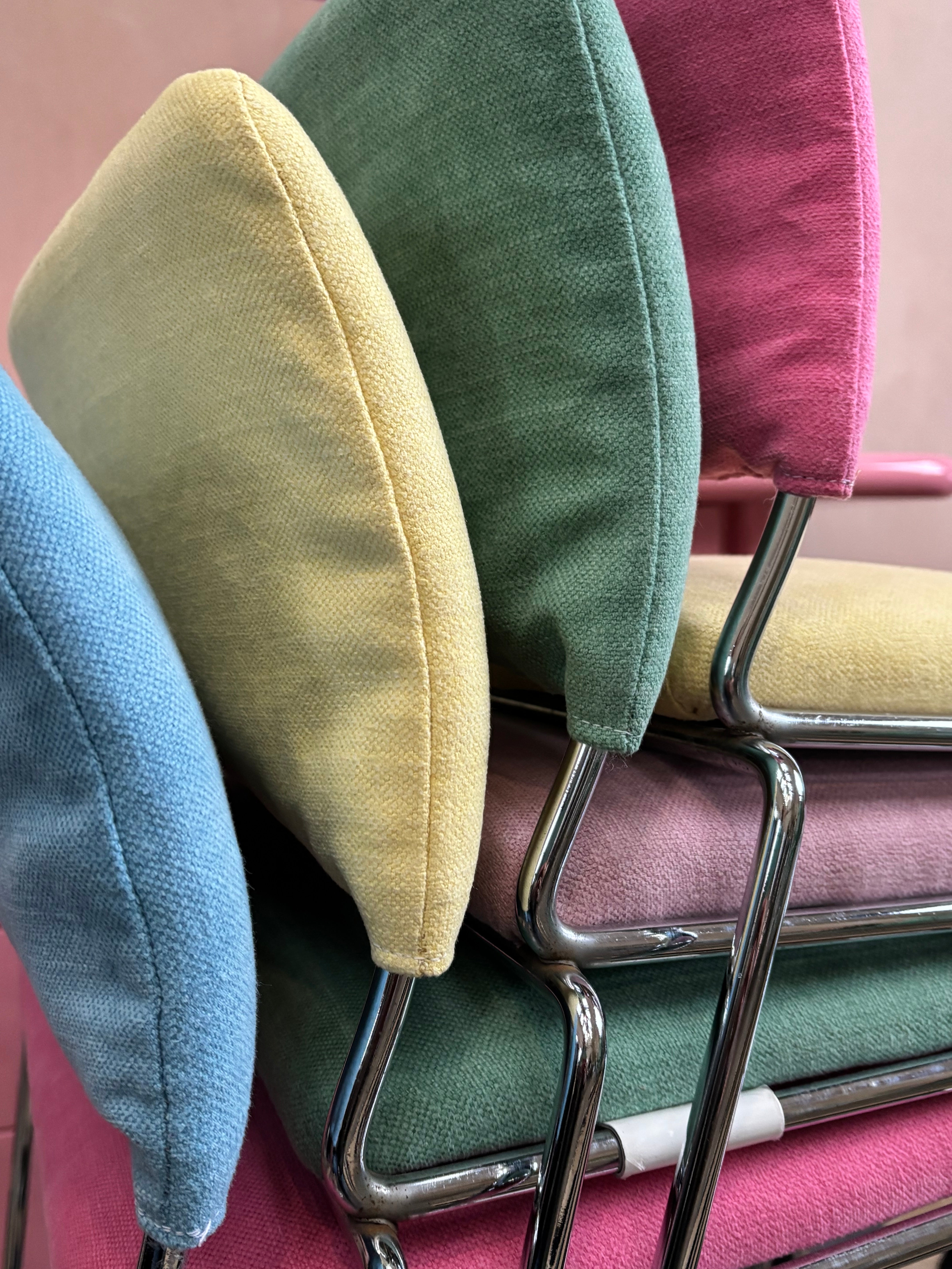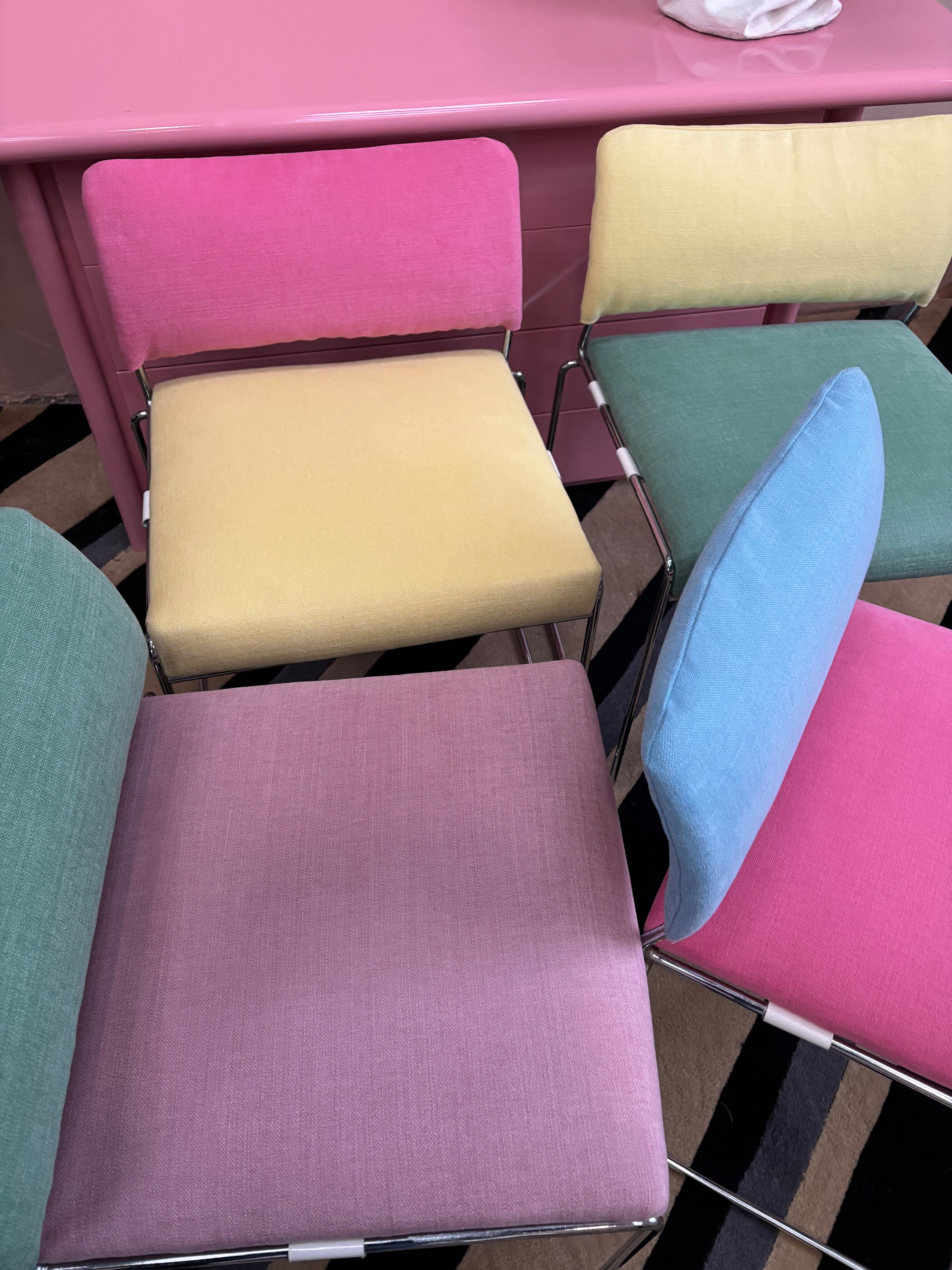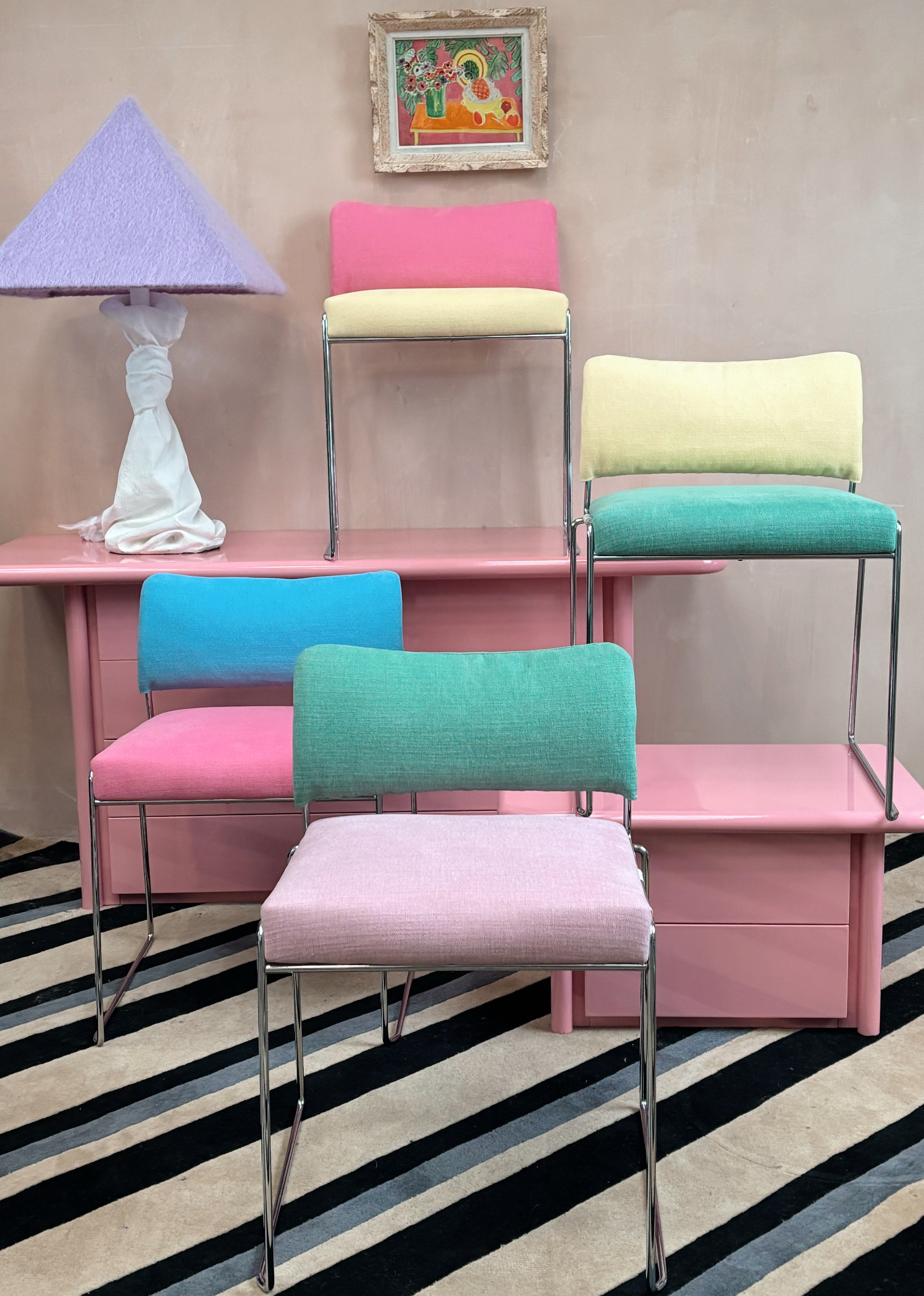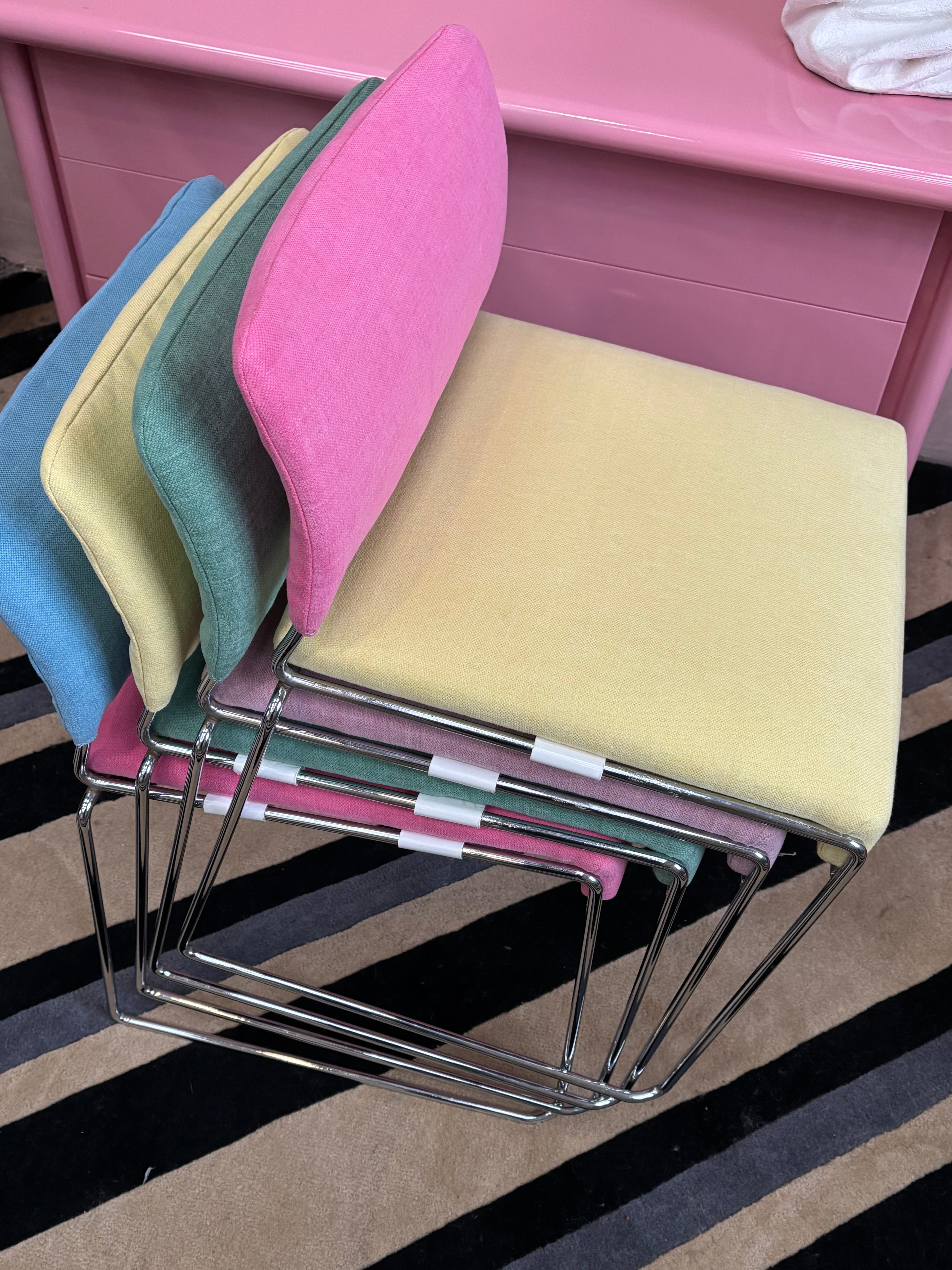 Padded seat and back Cushions hug a slim chrome frame. These have been freshly recovered therefore fabric is immaculate.